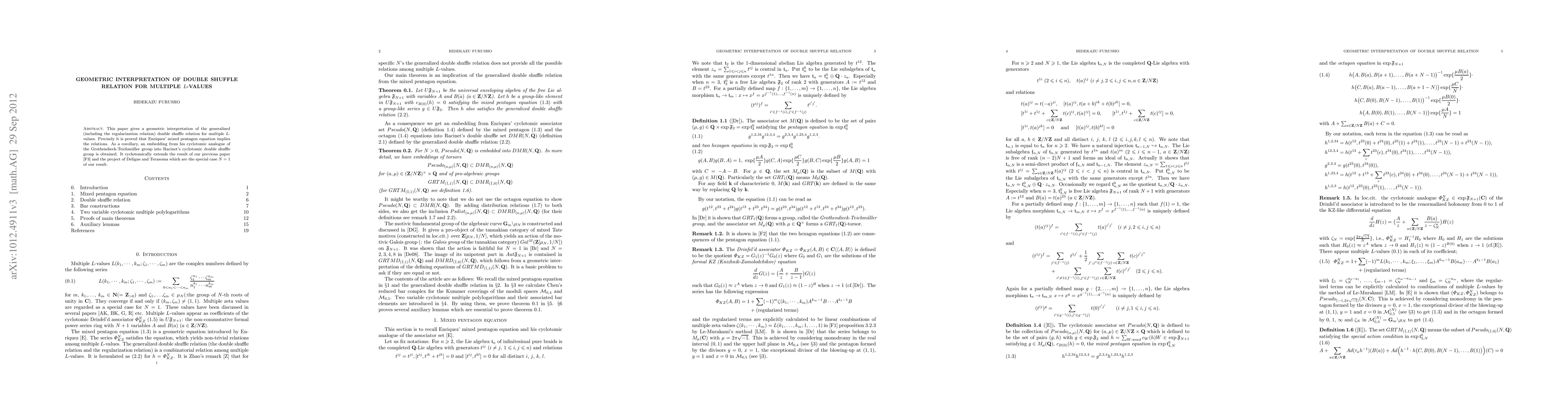 This paper gives a geometric interpretation of the generalized (including the regularization relation) double shuffle relation for multiple $L$-values. Precisely it is proved that Enriquez' mixed pentagon equation implies the relations. As a corollary, an embedding from his cyclotomic analogue of the Grothendieck-Teichmuller group into Racinet's cyclotomic double shuffle group is obtained. It cyclotomically extends the result of our previous paper and the project of Deligne and Terasoma which are the special case N=1 of our result.