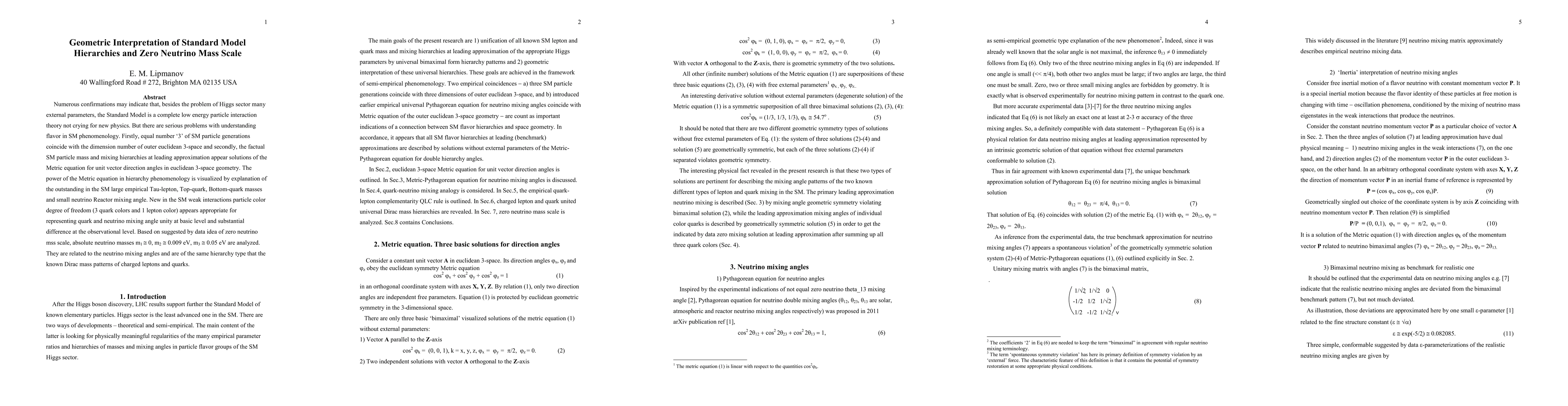 This paper explores the geometric interpretation of the Standard Model's particle hierarchies, suggesting that the SM's mass and mixing patterns are solutions of the Metric equation in 3-dimensional Euclidean space. It proposes a zero neutrino mass scale and analyzes the absolute neutrino masses, aligning them with the known Dirac mass patterns of charged leptons and quarks.