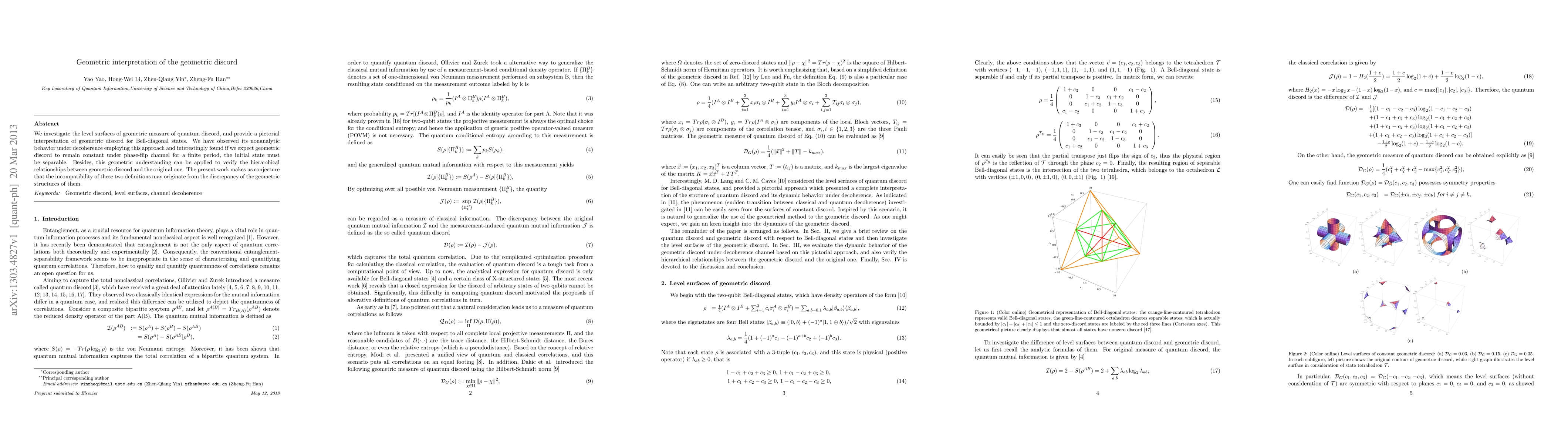 This paper explores the geometric measure of quantum discord through level surfaces, providing a visual interpretation for Bell-diagonal states. It reveals nonanalytic behavior under decoherence and suggests that geometric discord remains constant under phase-flip channel only for separable states, hinting at structural discrepancies between geometric and original discord definitions.
