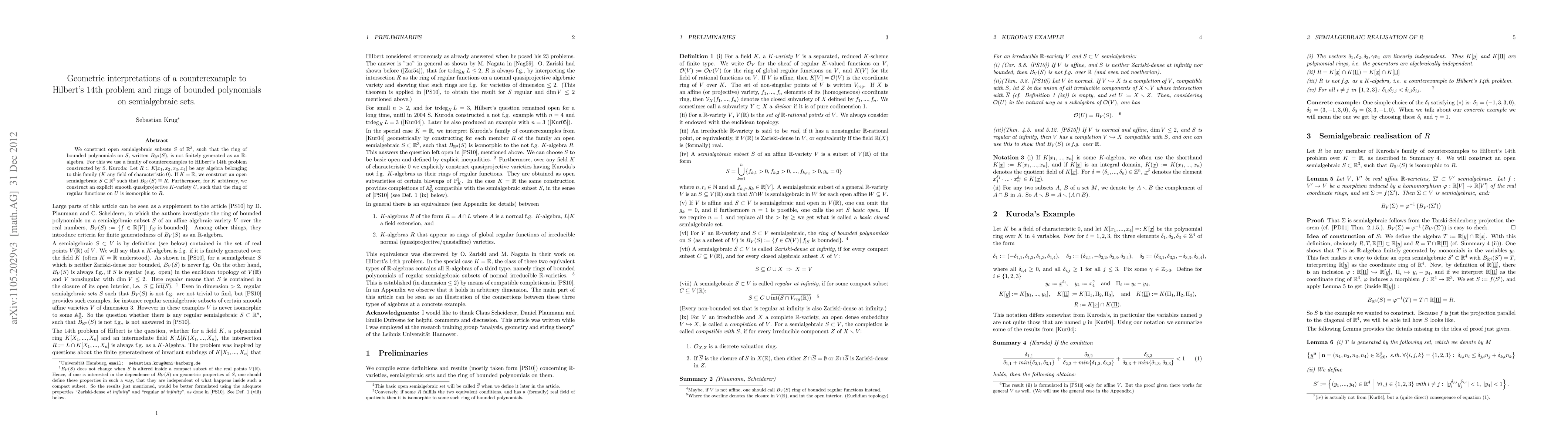 We interpret a counterexample to Hilbert's 14th problem by S. Kuroda geometrically in two ways: As ring of regular functions on a smooth rational quasiprojective variety over any field K of characteristic 0, and, in the special case where K are the real numbers R, as the ring of bounded polynomials on a regular semialgebraic subset of R^3. One motivation for this was to find a regular semialgebraic subset of a real vectorspace, such that the ring of bounded polynomials on it is not finitely generated as an R-algebra. In an appendix we prove some general properties of rings of bounded polynomials on regular semialgebraic subsets of normal R-varieties.