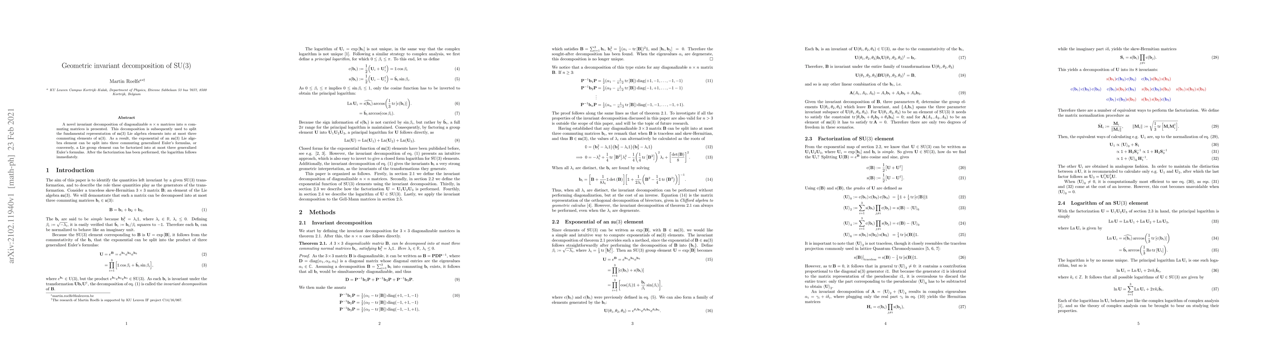 A novel invariant decomposition of diagonalizable $n \times n$ matrices into $n$ commuting matrices is presented. This decomposition is subsequently used to split the fundamental representation of $\mathfrak{su}(3)$ Lie algebra elements into at most three commuting elements of $\mathfrak{u}(3)$. As a result, the exponential of an $\mathfrak{su}(3)$ Lie algebra element can be split into three commuting generalized Euler's formulas, or conversely, a Lie group element can be factorized into at most three generalized Euler's formulas. After the factorization has been performed, the logarithm follows immediately.