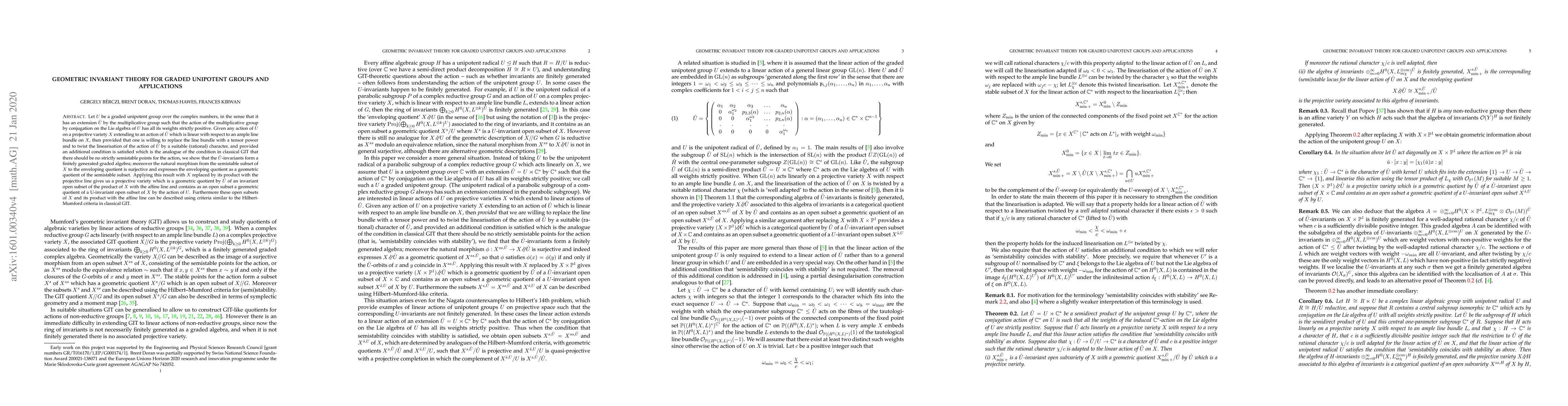 Let $U$ be a graded unipotent group over the complex numbers, in the sense that it has an extension $\hat{U}$ by the multiplicative group such that the action of the multiplicative group by conjugation on the Lie algebra of $U$ has all its weights strictly positive. Given any action of $U$ on a projective variety $X$ extending to an action of $\hat{U}$ which is linear with respect to an ample line bundle on $X$, then provided that one is willing to replace the line bundle with a tensor power and to twist the linearisation of the action of $\hat{U}$ by a suitable (rational) character, and provided an additional condition is satisfied which is the analogue of the condition in classical GIT that there should be no strictly semistable points for the action, we show that the $\hat{U}$-invariants form a finitely generated graded algebra; moreover the natural morphism from the semistable subset of $X$ to the enveloping quotient is surjective and expresses the enveloping quotient as a geometric quotient of the semistable subset. Applying this result with $X$ replaced by its product with the projective line gives us a projective variety which is a geometric quotient by $\hat{U}$ of an invariant open subset of the product of $X$ with the affine line and contains as an open subset a geometric quotient of a U-invariant open subset of $X$ by the action of $U$. Furthermore these open subsets of $X$ and its product with the affine line can be described using criteria similar to the Hilbert-Mumford criteria in classical GIT.