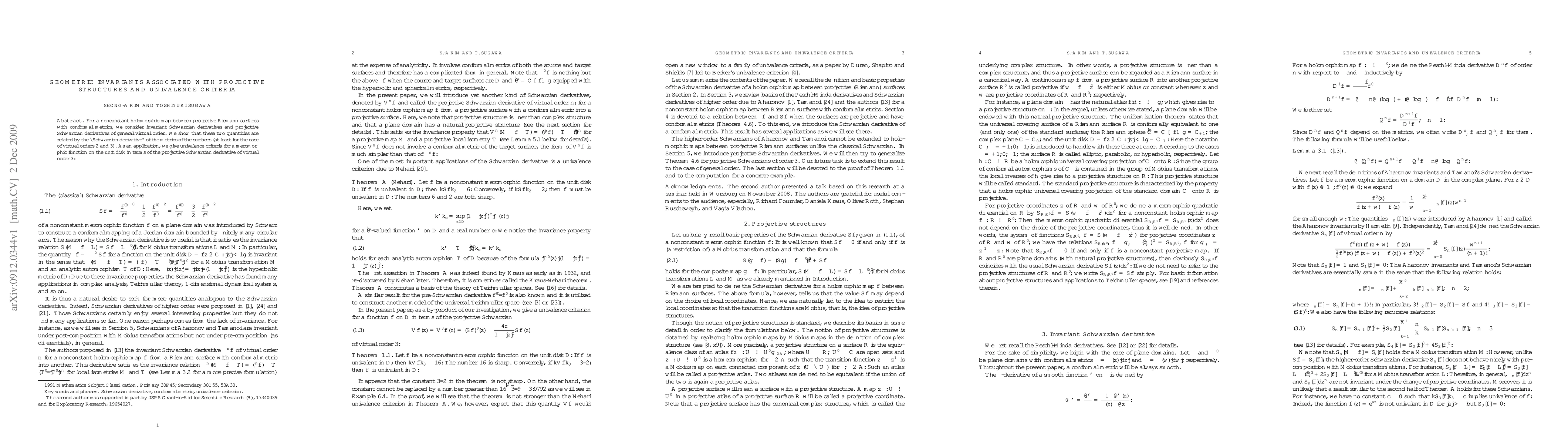 This paper explores geometric invariants associated with projective structures and univalence criteria for meromorphic functions on the unit disk, revealing a connection between invariant Schwarzian derivatives and projective Schwarzian derivatives of specific virtual orders.