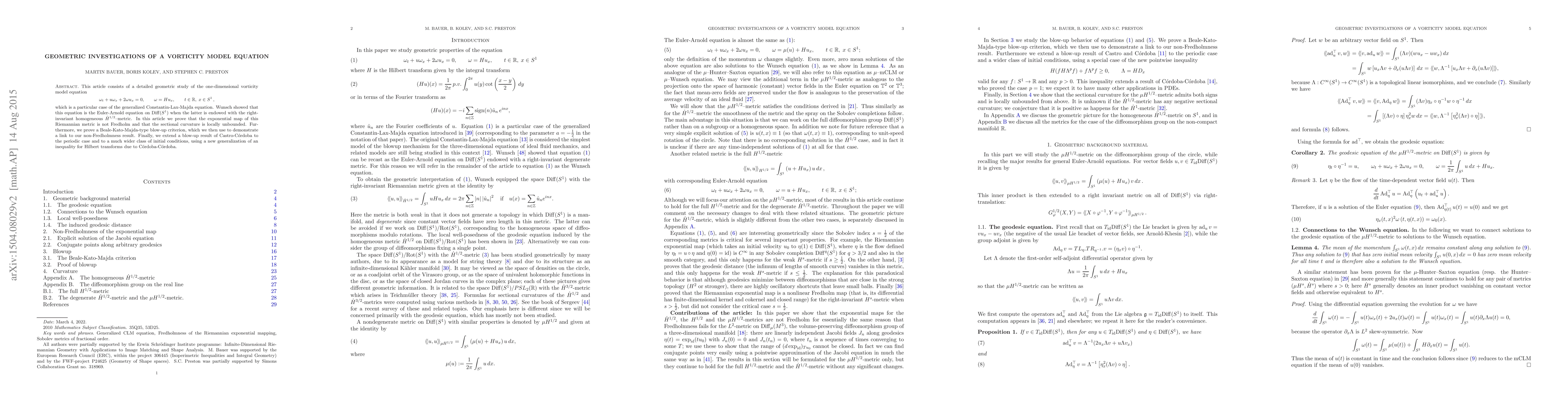This article consists of a detailed geometric study of the one-dimensional vorticity model equation $$\omega_{t} + u\omega_{x} + 2\omega u_{x} = 0, \qquad \omega = H u_{x}, \qquad t\in\mathbb{R},\; x\in S^{1}\,,$$ which is a particular case of the generalized Constantin-Lax-Majda equation. Wunsch showed that this equation is the Euler-Arnold equation on $\operatorname{Diff}(S^{1})$ when the latter is endowed with the right-invariant homogeneous $\dot{H}^{1/2}$-metric. In this article we prove that the exponential map of this Riemannian metric is not Fredholm and that the sectional curvature is locally unbounded. Furthermore, we prove a Beale-Kato-Majda-type blow-up criterion, which we then use to demonstrate a link to our non-Fredholmness result. Finally, we extend a blow-up result of Castro-C\'ordoba to the periodic case and to a much wider class of initial conditions, using a new generalization of an inequality for Hilbert transforms due to C\'ordoba-C\'ordoba.