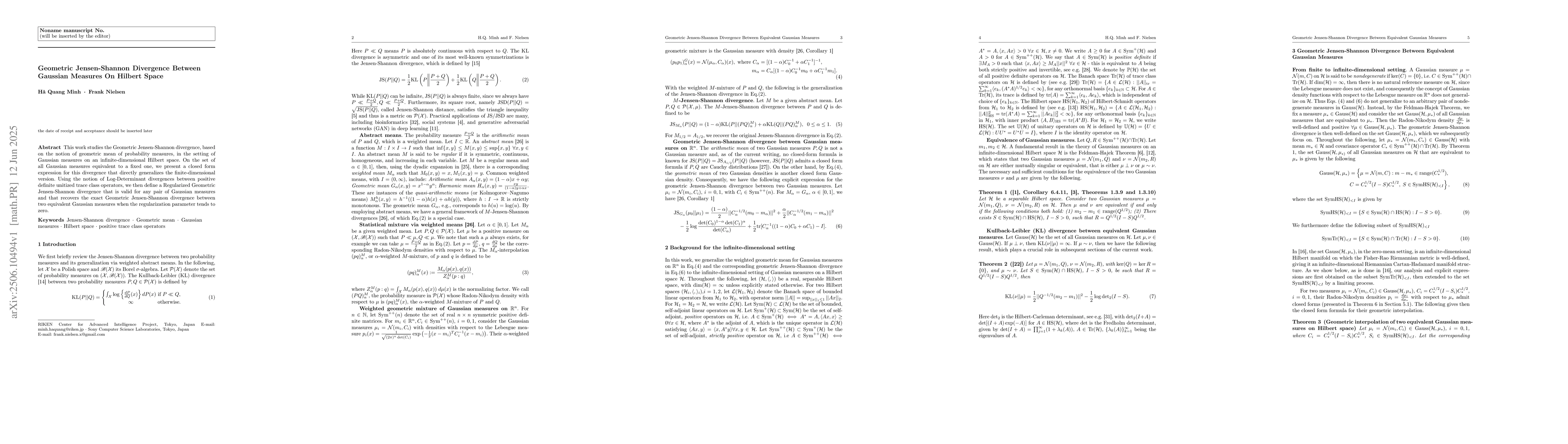 Researchers develop a formula for Geometric Jensen-Shannon divergence between Gaussian measures on infinite-dimensional Hilbert space, providing a generalization of the finite-dimensional version and a regularized form that recovers exact values when the regularization parameter tends to zero.