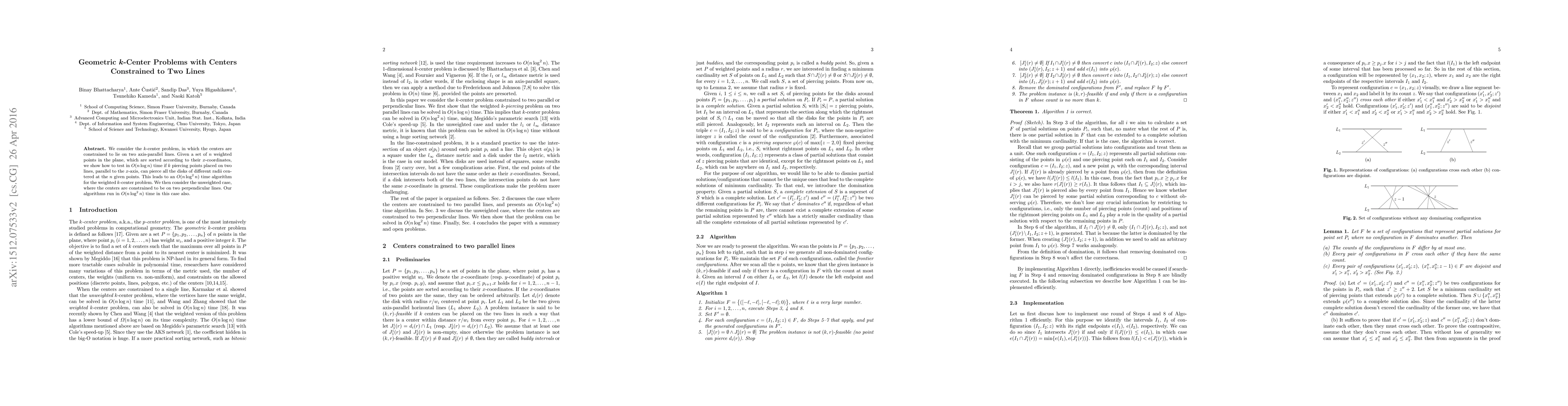 We consider the $k$-center problem in which the centers are constrained to lie on two lines. Given a set of $n$ weighted points in the plane, we want to locate up to $k$ centers on two parallel lines. We present an $O(n\log^2 n)$ time algorithm, which minimizes the weighted distance from any point to a center. We then consider the unweighted case, where the centers are constrained to be on two perpendicular lines. Our algorithms run in $O(n\log^2 n)$ time also in this case.