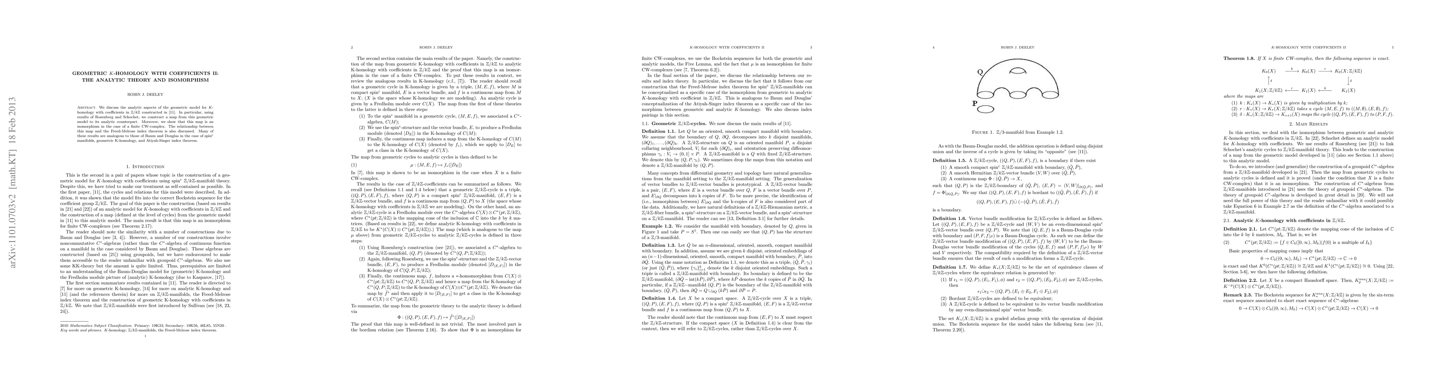 The construction of an isomorphism between the geometric and analytic models of $K$-homology with coefficients in $\mathbb{Z}/k\mathbb{Z}$ for finite CW-complexes, along with its connection to the Freed-Melrose index theorem.