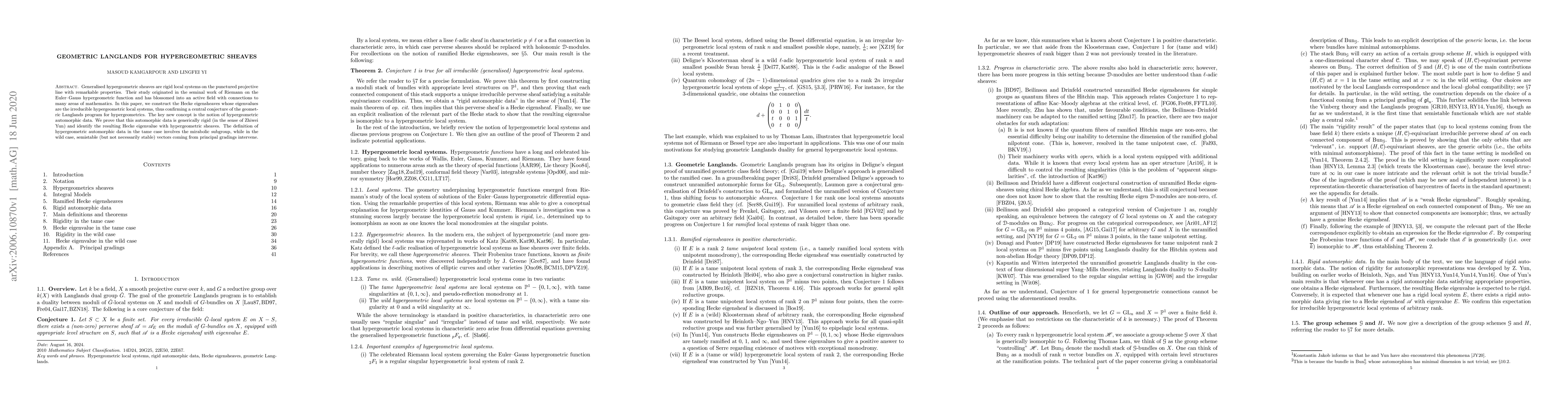 Researchers construct a connection between hypergeometric sheaves and the geometric Langlands program, confirming a central conjecture by introducing a new concept called hypergeometric automorphic data.