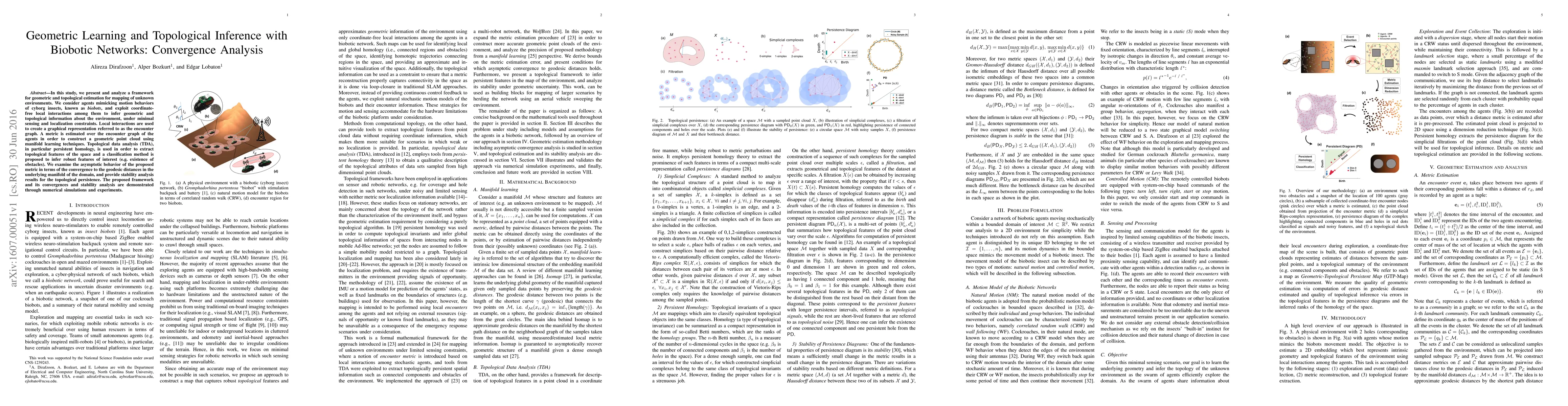 This paper proposes a framework for geometric and topological inference using biobot agents that mimic cyborg insects, leveraging local interactions to map unknown environments. The study employs manifold learning and persistent homology for feature extraction and convergence analysis, demonstrating robustness through simulations and experiments.