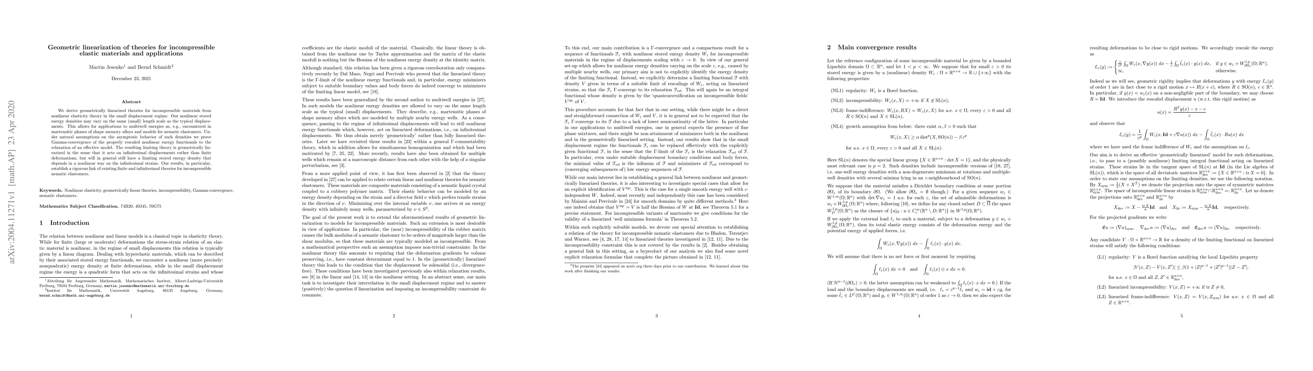 This paper derives geometrically linearized theories for incompressible elastic materials from nonlinear elasticity, focusing on small displacements. It establishes a rigorous link between finite and infinitesimal theories, proving Gamma-convergence for multiwell energies, and applies the results to materials like shape memory alloys and nematic elastomers.
