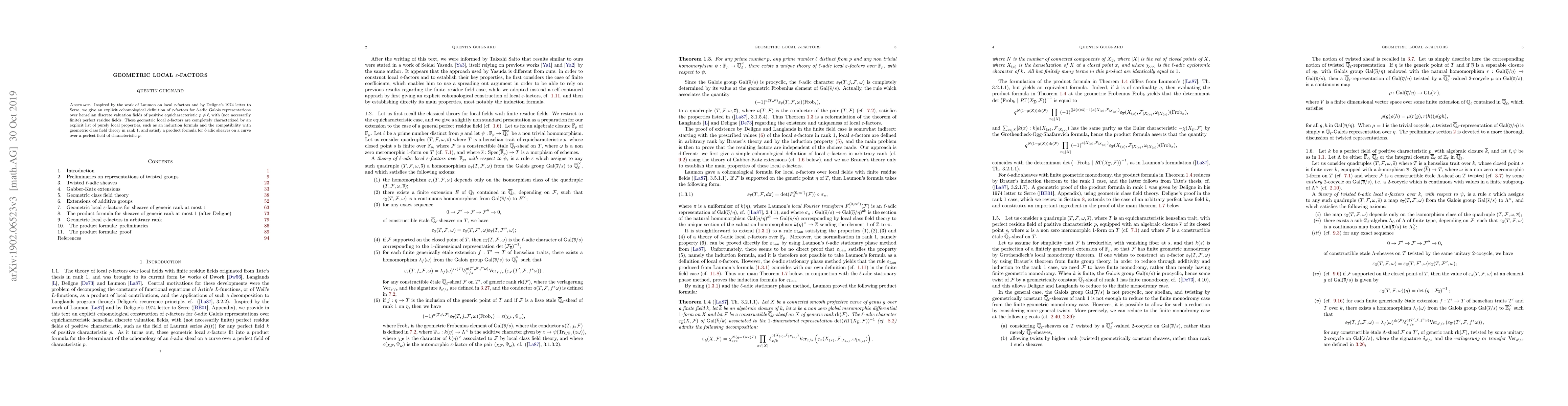Inspired by the work of Laumon on $\varepsilon$-factors and by Deligne's $1974$ letter to Serre, we give an explicit cohomological definition of $\varepsilon$-factors for $\ell$-adic Galois representations over henselian discrete valuation fields of positive equicharacteristic $p \neq \ell$, with (not necessarily finite) perfect residue fields. These geometric local $\varepsilon$-factors are completely characterized by an explicit list of purely local properties, such as an induction formula and the compatibility with geometric class field theory in rank $1$, and satisfy a product formula for $\ell$-adic sheaves on a curve over a perfect field of characteristic $p$.