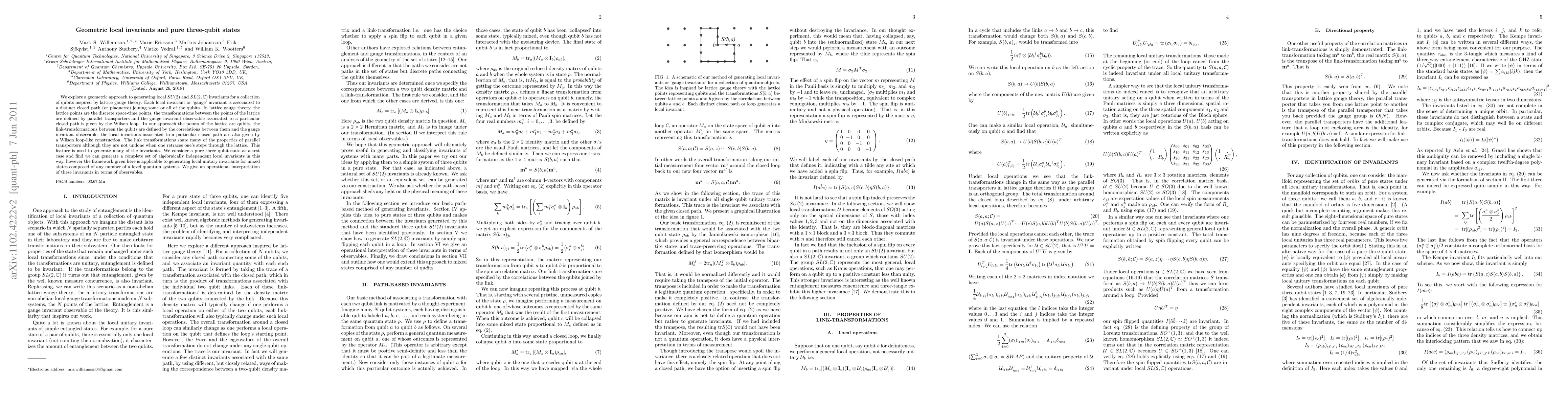 We explore a geometric approach to generating local SU(2) and $SL(2,\mathbb{C})$ invariants for a collection of qubits inspired by lattice gauge theory. Each local invariant or 'gauge' invariant is associated to a distinct closed path (or plaquette) joining some or all of the qubits. In lattice gauge theory, the lattice points are the discrete space-time points, the transformations between the points of the lattice are defined by parallel transporters and the gauge invariant observable associated to a particular closed path is given by the Wilson loop. In our approach the points of the lattice are qubits, the link-transformations between the qubits are defined by the correlations between them and the gauge invariant observable, the local invariants associated to a particular closed path are also given by a Wilson loop-like construction. The link transformations share many of the properties of parallel transporters although they are not undone when one retraces one's steps through the lattice. This feature is used to generate many of the invariants. We consider a pure three qubit state as a test case and find we can generate a complete set of algebraically independent local invariants in this way, however the framework given here is applicable to mixed states composed of any number of $d$ level quantum systems. We give an operational interpretation of these invariants in terms of observables.