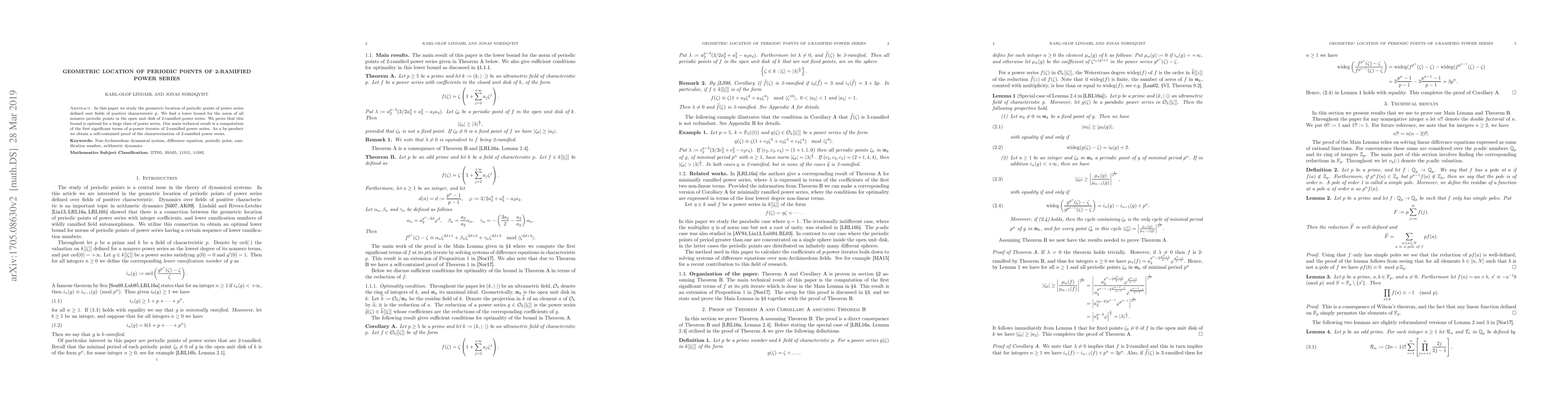 This paper investigates the geometric positioning of periodic points for 2-ramified power series over fields of prime characteristic $p$, establishing an optimal lower bound for the absolute value of such points within the open unit disk. The study also provides a self-contained proof of the characterization of 2-ramified power series.