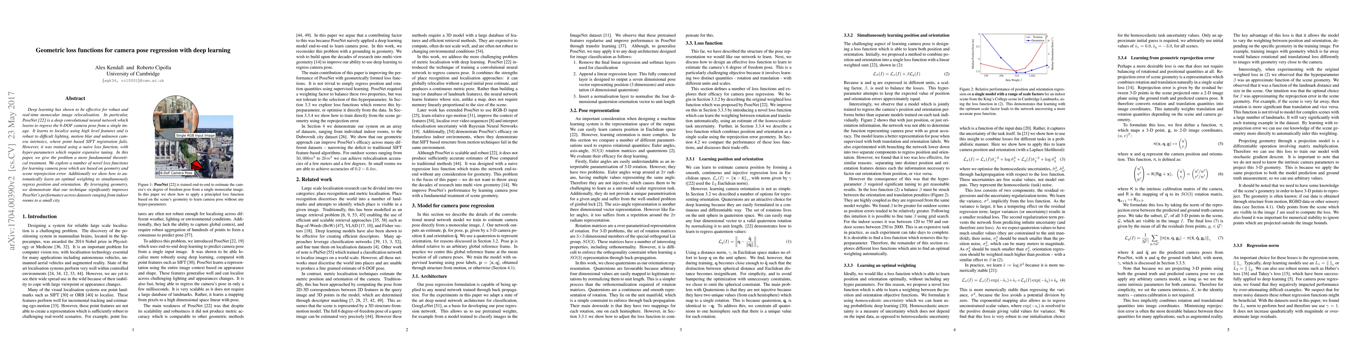 Deep learning has shown to be effective for robust and real-time monocular image relocalisation. In particular, PoseNet is a deep convolutional neural network which learns to regress the 6-DOF camera pose from a single image. It learns to localize using high level features and is robust to difficult lighting, motion blur and unknown camera intrinsics, where point based SIFT registration fails. However, it was trained using a naive loss function, with hyper-parameters which require expensive tuning. In this paper, we give the problem a more fundamental theoretical treatment. We explore a number of novel loss functions for learning camera pose which are based on geometry and scene reprojection error. Additionally we show how to automatically learn an optimal weighting to simultaneously regress position and orientation. By leveraging geometry, we demonstrate that our technique significantly improves PoseNet's performance across datasets ranging from indoor rooms to a small city.