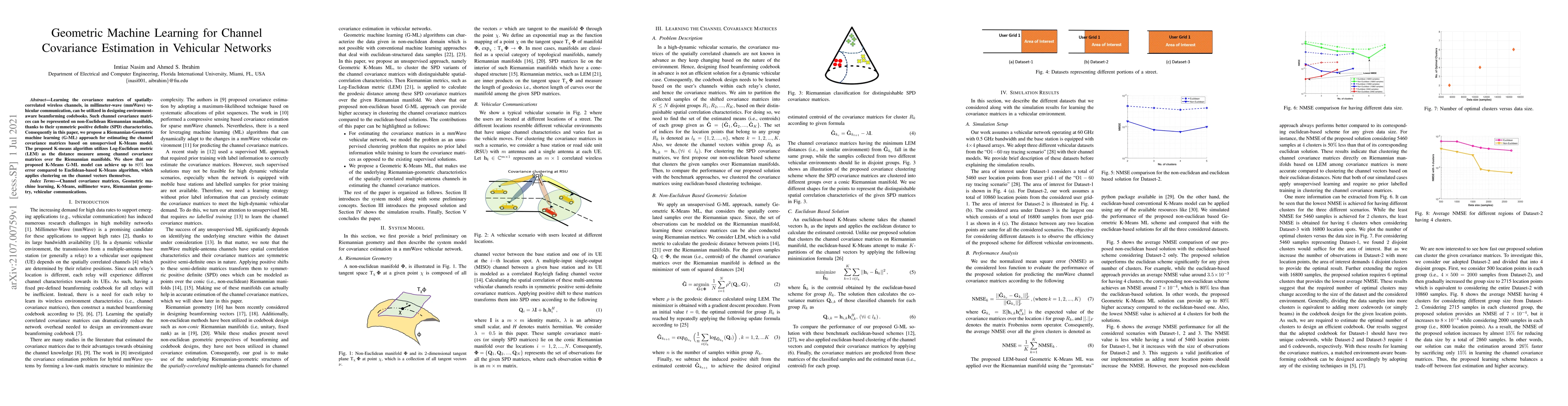 This paper proposes a Riemannian-Geometric machine learning approach for estimating channel covariance matrices in mmWave vehicular networks, utilizing a K-Means model on non-Euclidean Riemannian manifolds. The Log-Euclidean metric is used for distance measurement, achieving up to 80% less error compared to Euclidean-based K-Means.