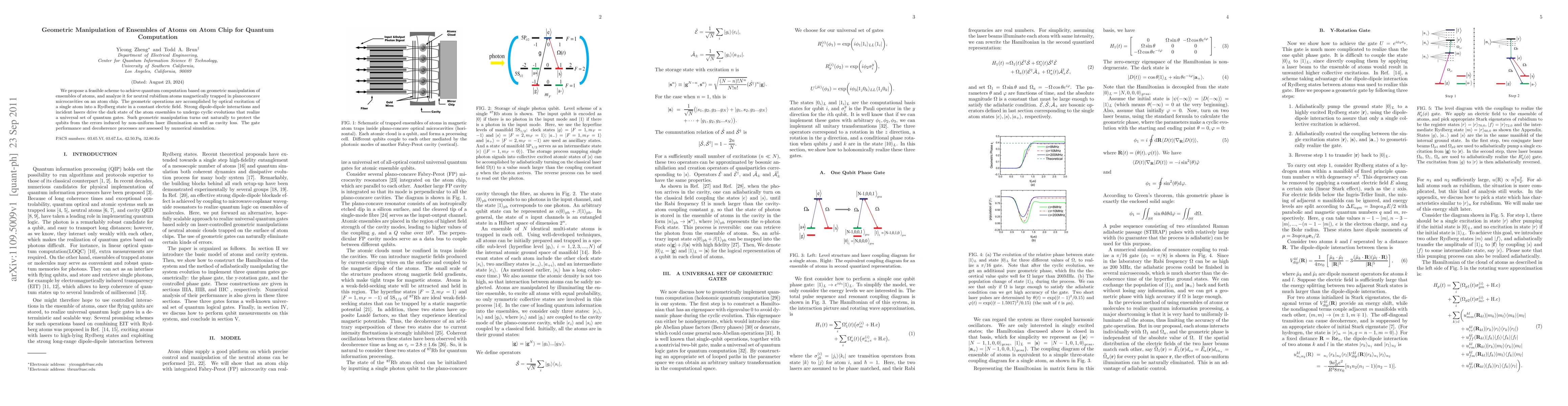 We propose a feasible scheme to achieve quantum computation based on geometric manipulation of ensembles of atoms, and analyze it for neutral rubidium atoms magnetically trapped in planoconcave microcavities on an atom chip. The geometric operations are accomplished by optical excitation of a single atom into a Rydberg state in a constant electric field. Strong dipole-dipole interactions and incident lasers drive the dark state of the atom ensembles to undergo cyclic evolutions that realize a universal set of quantum gates. Such geometric manipulation turns out naturally to protect the qubits from the errors induced by non-uniform laser illumination as well as cavity loss. The gate performance and decoherence processes are assessed by numerical simulation.