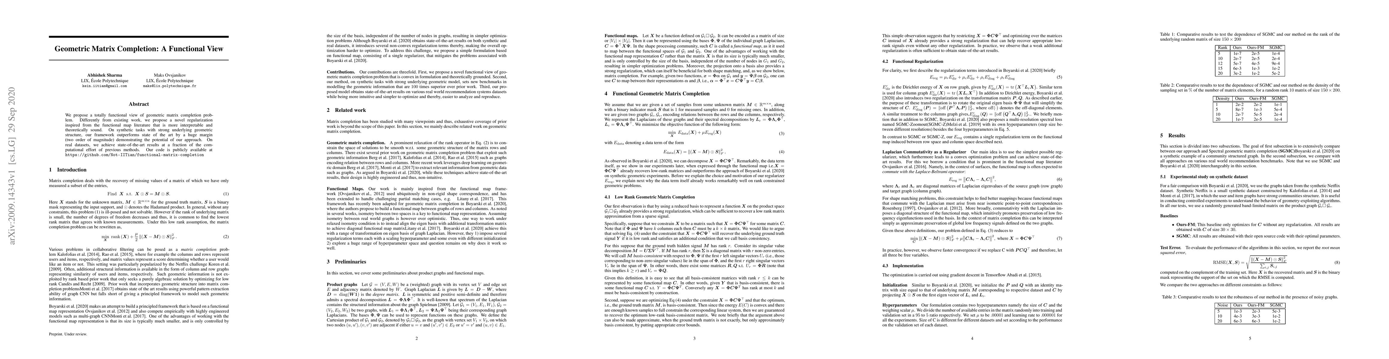 This paper introduces a novel functional regularization approach for geometric matrix completion, outperforming existing methods by two orders of magnitude on synthetic tasks and achieving state-of-the-art results on real datasets with reduced computational effort. The authors' method is theoretically sound and more interpretable.