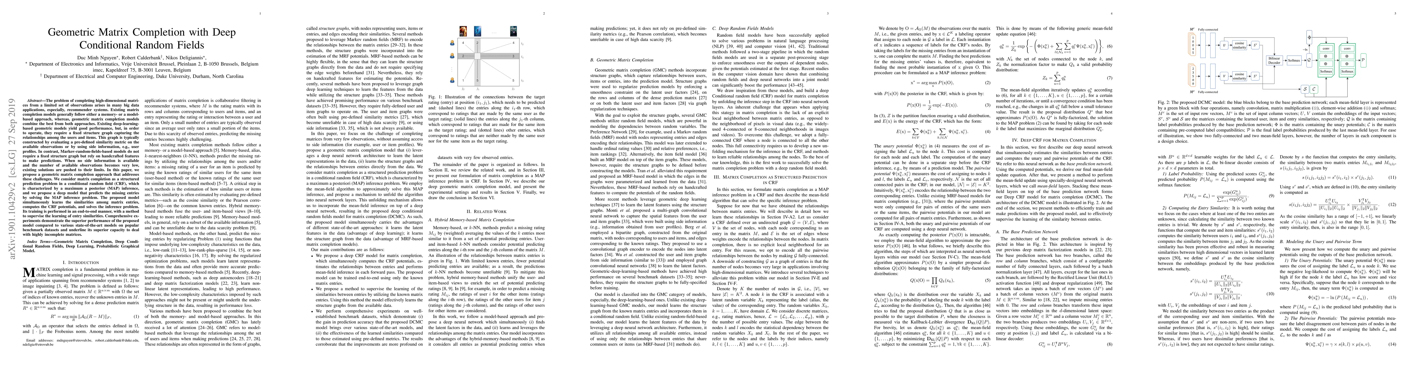 This paper proposes a novel geometric matrix completion method using deep conditional random fields (CRFs) to address the challenge of completing high-dimensional matrices with limited observations. Unlike existing models, the proposed approach learns similarities and solves the maximum a posteriori inference problem end-to-end, demonstrating superior performance on benchmark datasets, especially with highly incomplete matrices.
