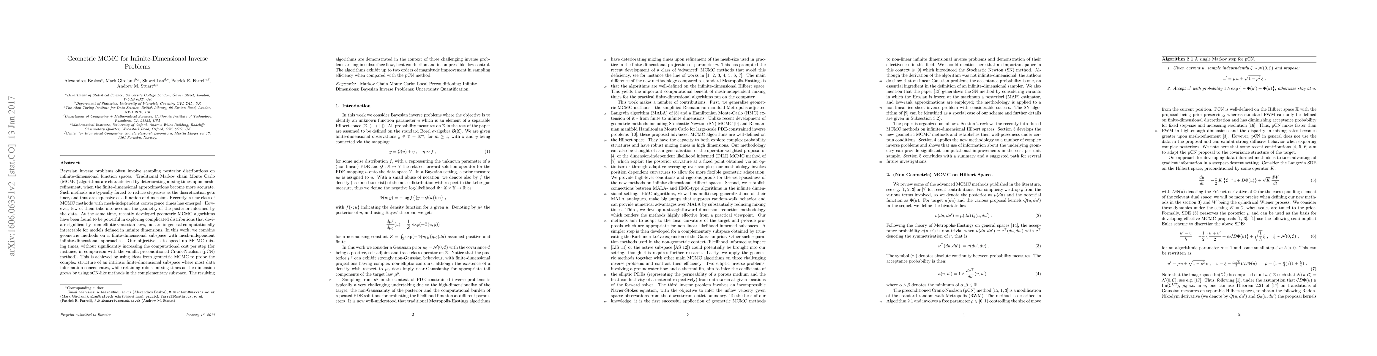 This paper proposes a new class of geometric MCMC methods for infinite-dimensional inverse problems, combining finite-dimensional geometric approaches with mesh-independent infinite-dimensional techniques to improve sampling efficiency. The resulting algorithms achieve up to two orders of magnitude improvement over traditional methods like the preconditioned Crank-Nicolson method, demonstrating significant efficiency gains in applications such as subsurface flow, heat conduction, and incompressible flow control.