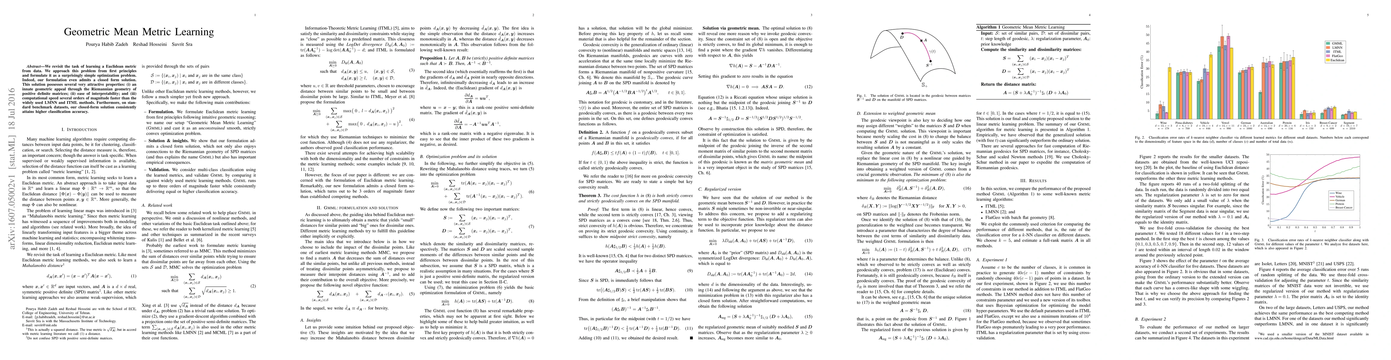 This paper presents a new method for learning Euclidean metrics from data called Geometric Mean Metric Learning, offering a closed-form solution with improved accuracy and speed compared to existing methods.