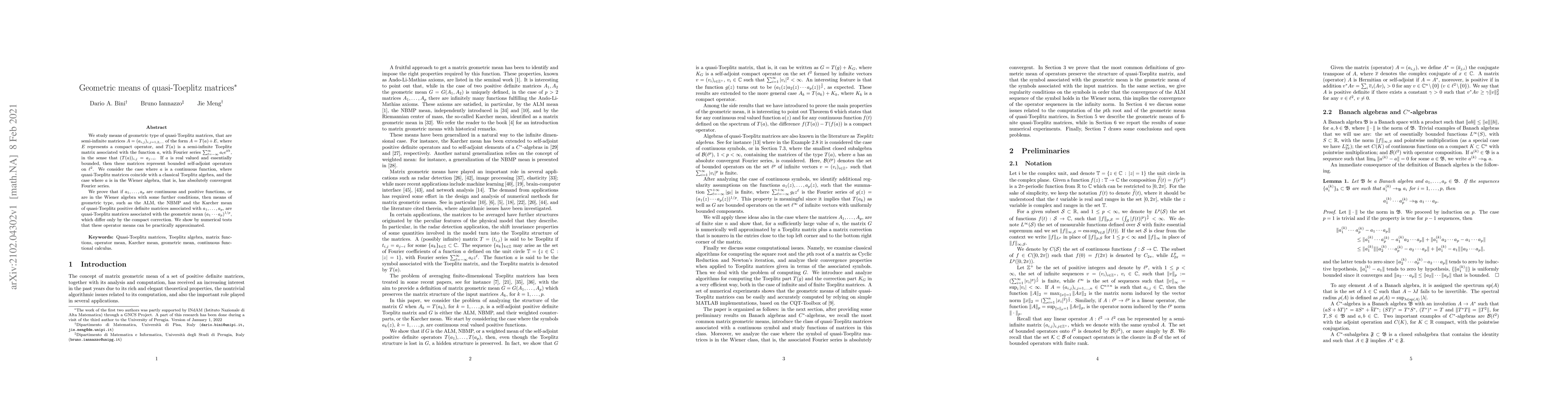 This paper investigates geometric means of quasi-Toeplitz matrices, which are semi-infinite matrices resembling Toeplitz forms with compact perturbations. It proves that certain geometric means of quasi-Toeplitz positive definite matrices are themselves quasi-Toeplitz, differing only by a compact operator, and demonstrates practical approximations through numerical tests.