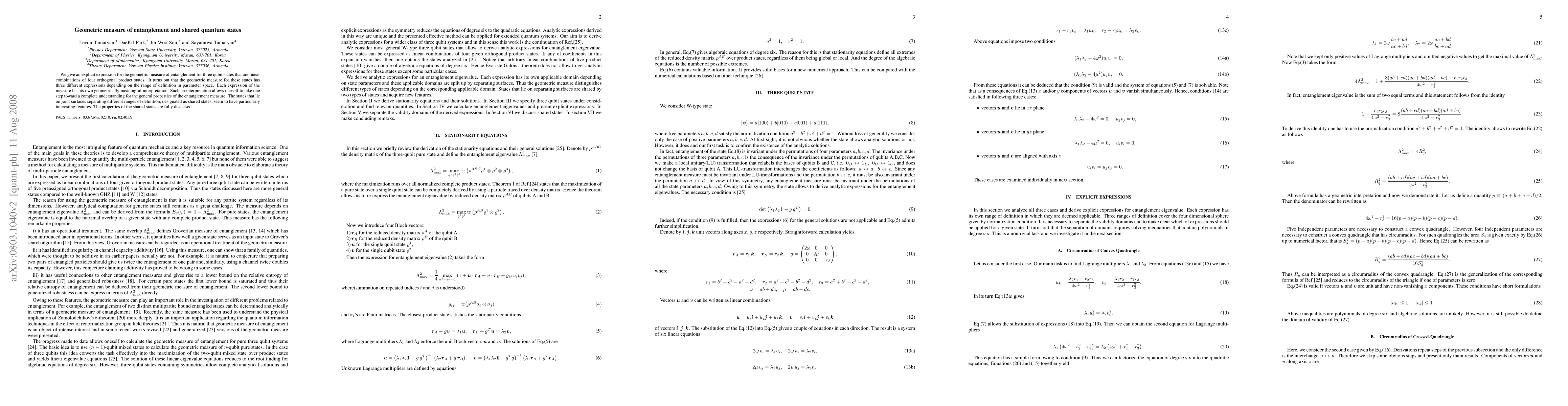 This paper introduces explicit expressions for the geometric measure of entanglement in three-qubit states with linear combinations of four orthogonal product states. It highlights unique features of 'shared states' that lie on boundaries between different definition ranges.