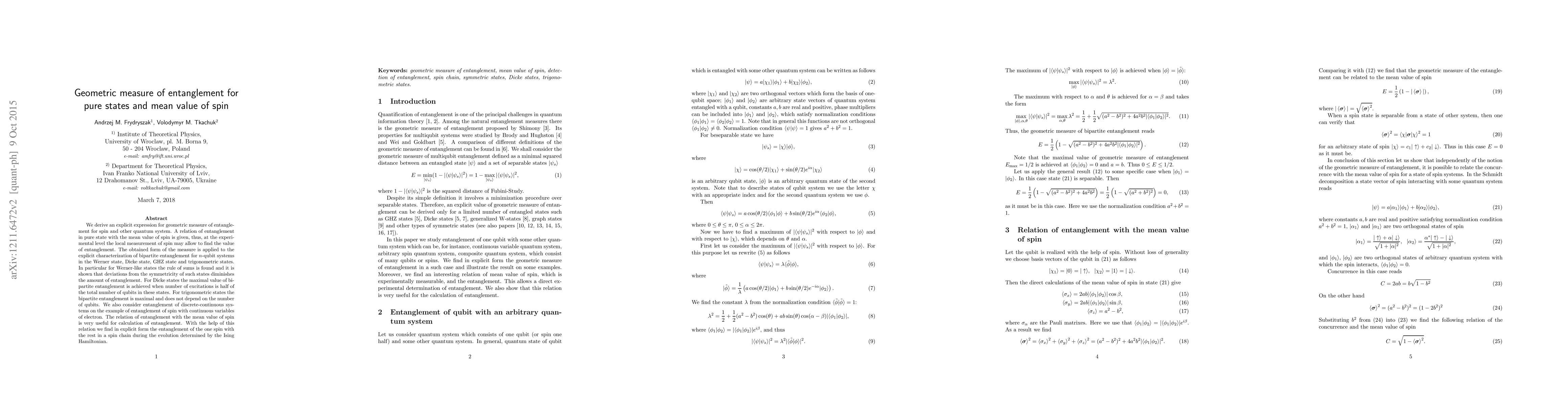 This paper derives a geometric measure of entanglement for pure quantum states and links it to the mean value of spin. It applies this measure to various $n$-qubit states, revealing how entanglement diminishes with deviations from symmetry and identifying conditions for maximal entanglement in different states.