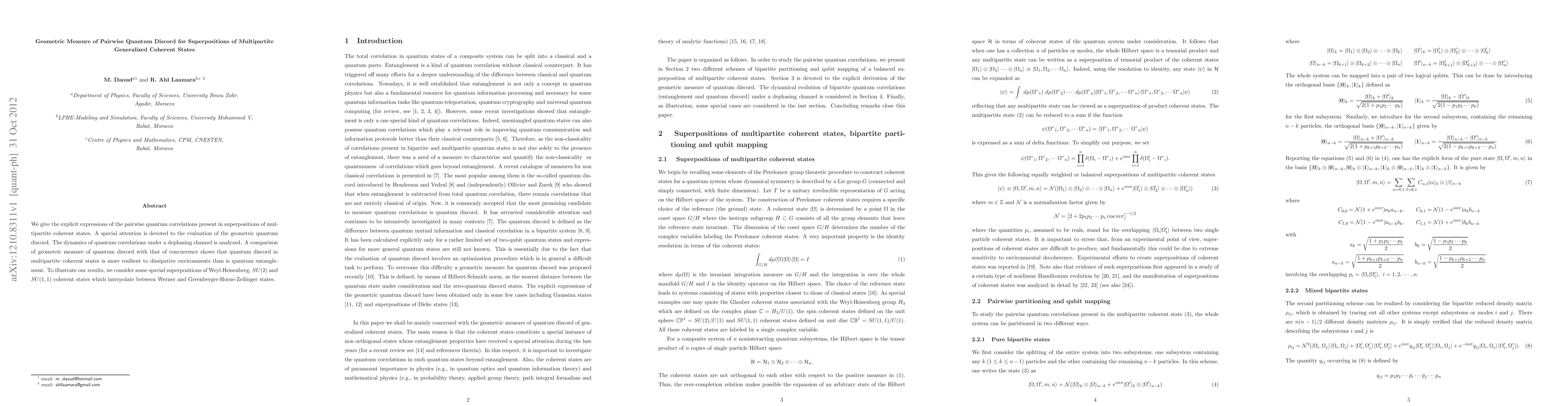 This paper derives explicit expressions for the pairwise quantum correlations in superpositions of multipartite generalized coherent states, focusing on the geometric measure of quantum discord. It finds that quantum discord is more robust than quantum entanglement against decoherence, using Weyl-Heisenberg, SU(2), and SU(1,1) coherent states for illustration.