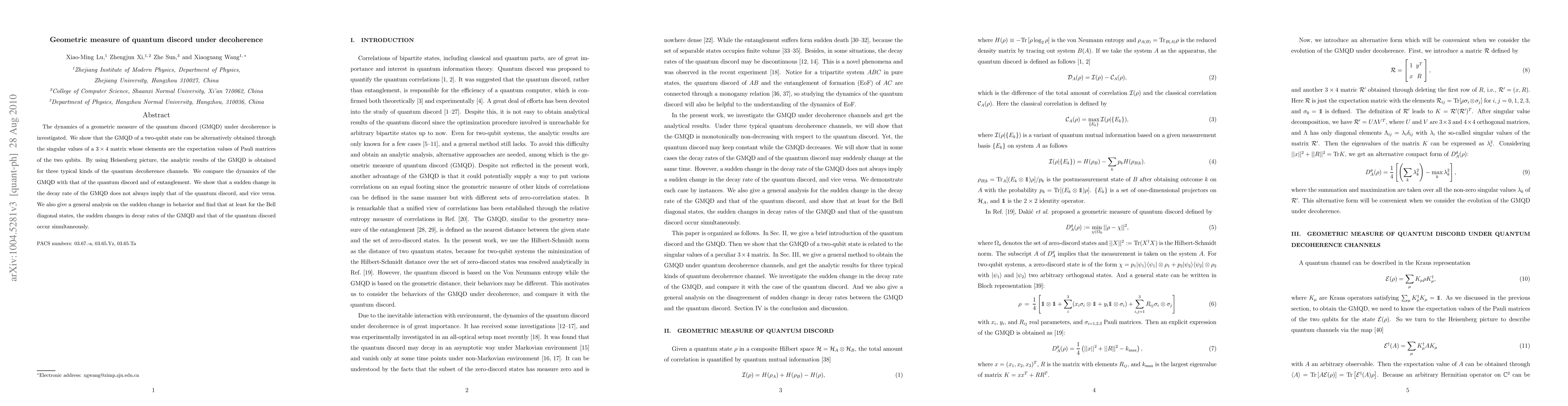 This paper investigates the dynamics of a geometric measure of quantum discord (GMQD) under decoherence, showing that it can be derived from singular values of a matrix formed by Pauli matrices' expectation values. The study reveals that GMQD's decay rate changes do not always correlate with those of quantum discord or entanglement, except for Bell diagonal states where both show simultaneous sudden changes.