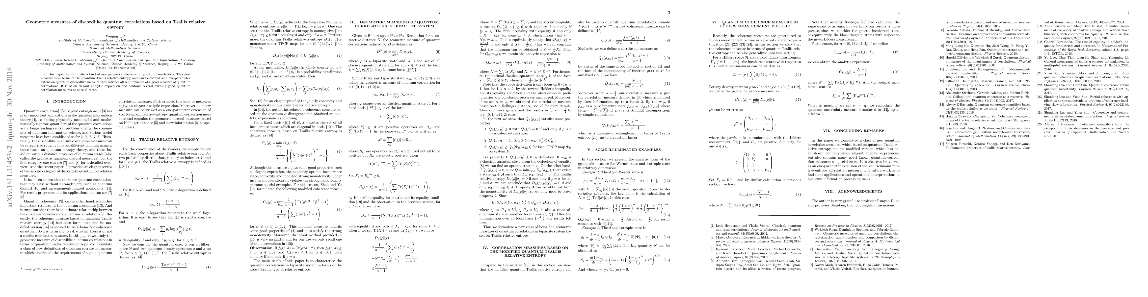 This paper introduces a new geometric measure of quantum correlations based on Tsallis relative entropy, extending quantum discordlike measures. It provides an elegant analytic expression that encompasses several existing measures as special cases and meets all criteria for a robust quantum correlation measure.