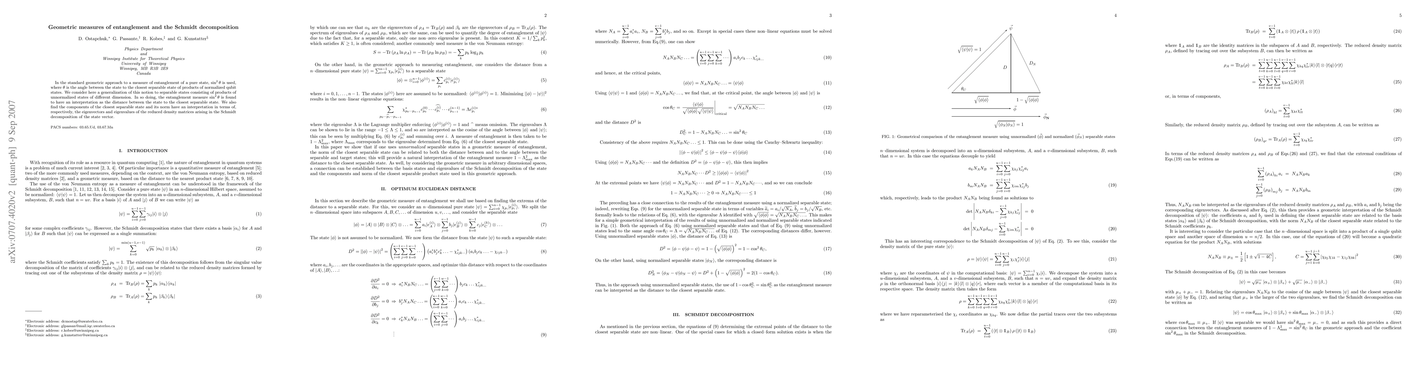 This paper generalizes the geometric measure of entanglement, $\sin^2\theta$, to separable states composed of unnormalized products of different dimensional states. It interprets $\sin^2\theta$ as the distance to the nearest separable state and relates the components and norms of this state to the eigenvectors and eigenvalues from the Schmidt decomposition.