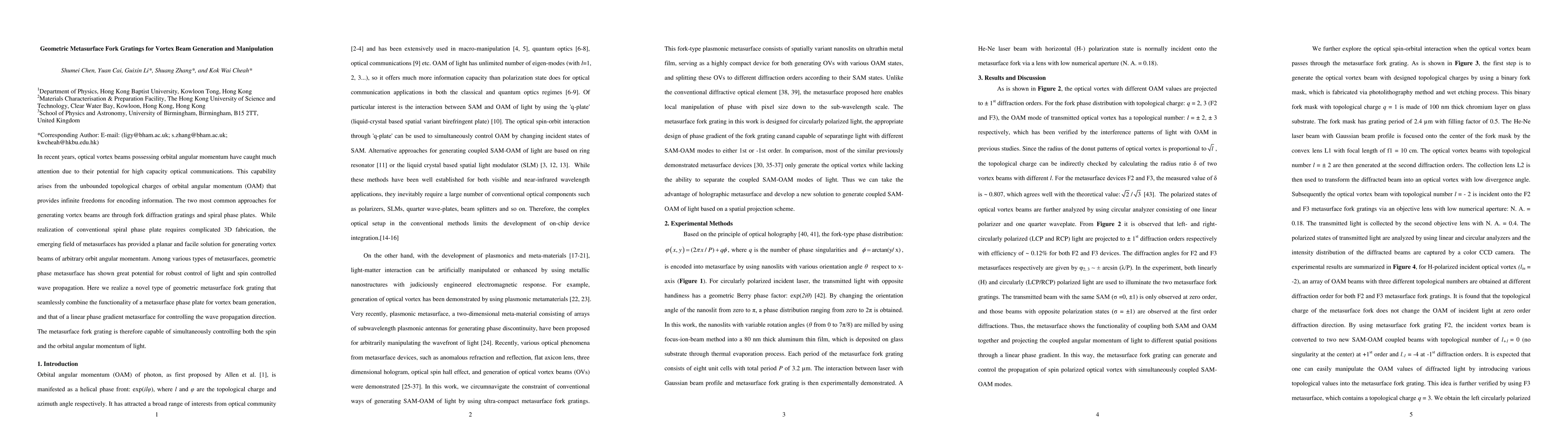 This paper introduces a novel geometric metasurface fork grating that efficiently generates and manipulates optical vortex beams by combining the functionalities of a metasurface phase plate and a linear phase gradient metasurface, enabling control over both spin and orbital angular momentum of light for advanced optical communications.
