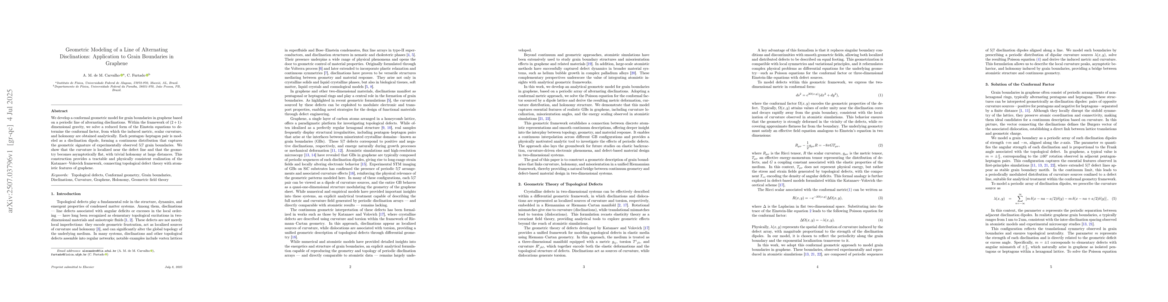 We develop a conformal geometric model for grain boundaries in graphene based on a periodic line of alternating disclinations. Within the framework of (2+1)-dimensional gravity, we solve a reduced form of the Einstein equations to determine the conformal factor, from which the induced metric, scalar curvature, and holonomy are obtained analytically. Each pentagon-heptagon pair is modeled as a disclination dipole, forming a continuous distribution that captures the geometric signature of experimentally observed 5-7 grain boundaries. We show that the curvature is localized near the defect line and that the geometry becomes asymptotically flat, with trivial holonomy at large distances. This construction provides a tractable and physically consistent realization of the Katanaev-Volovich framework, connecting topological defect theory with atomistic features of graphene.