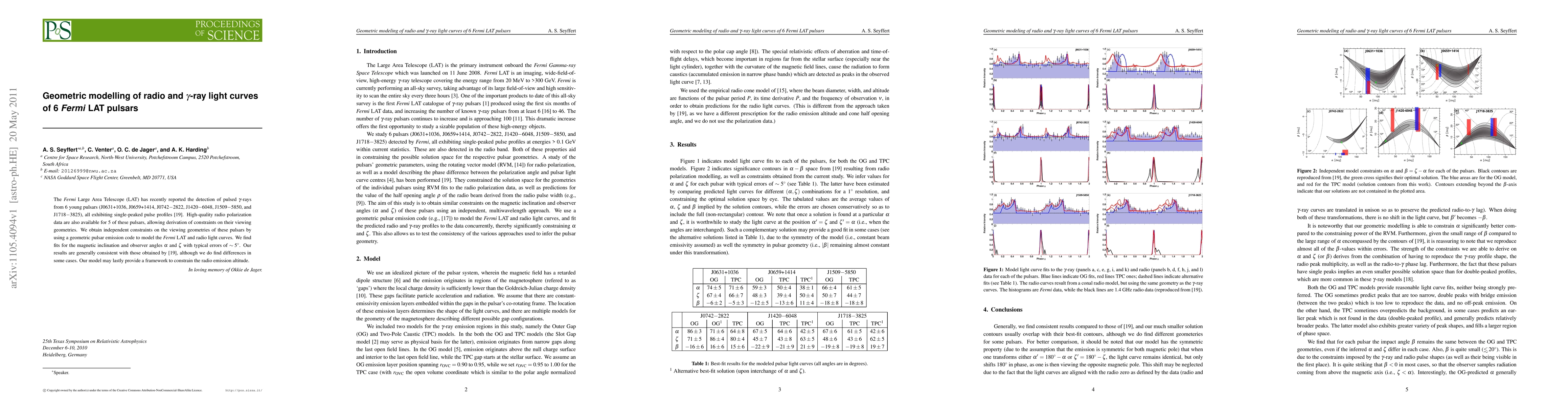 This paper uses a geometric modelling approach to analyze the light curves of six pulsars detected by the Fermi LAT, deriving constraints on their viewing geometries and magnetic inclination angles. The results are consistent with previous findings but highlight differences in some cases, offering a framework for further study of radio emission altitudes.