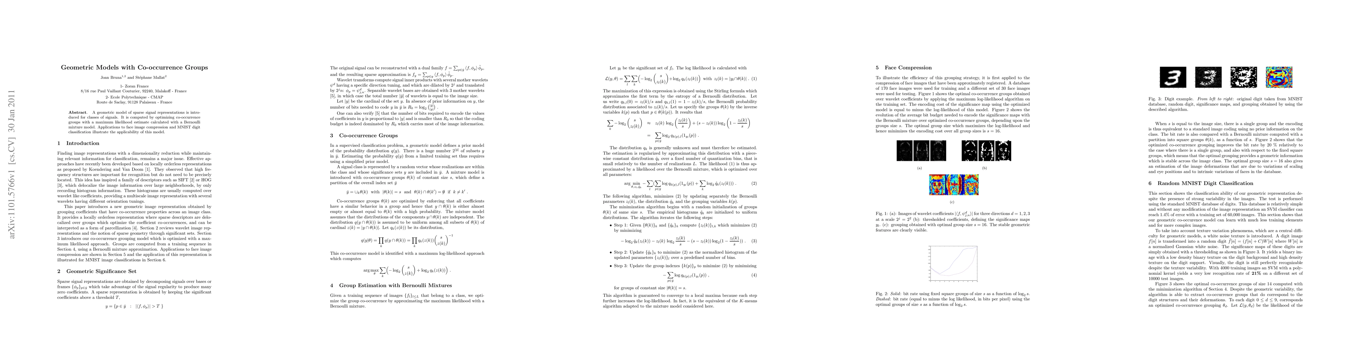 A new geometric model optimizes co-occurrence groups for sparse signal representations, with applications in image compression and digit classification, using a Bernoulli mixture model.