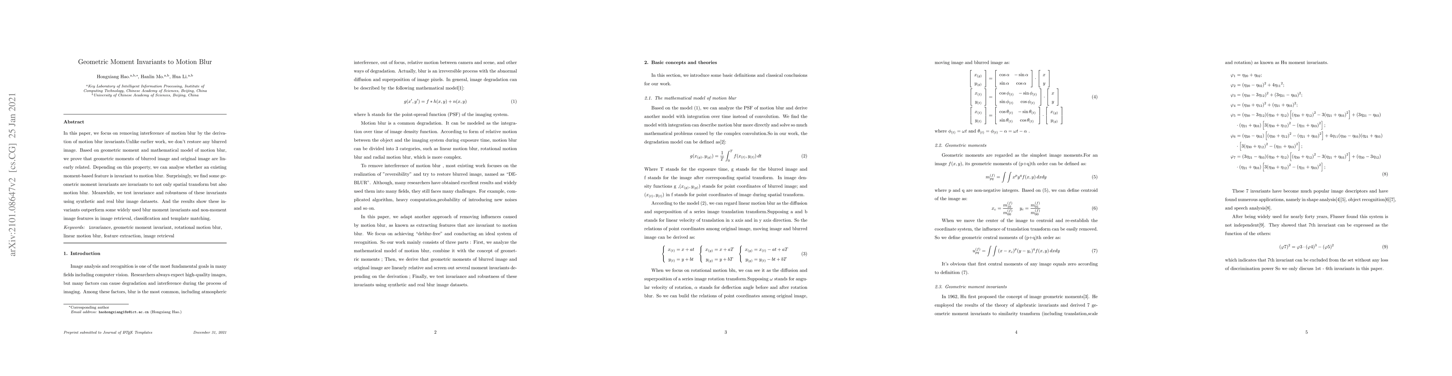 This paper develops geometric moment invariants to identify features that remain consistent despite motion blur, demonstrating their superior performance in image retrieval, classification, and template matching compared to existing methods. The study proves the linear relationship between geometric moments of blurred and original images, revealing certain invariants that are robust to both spatial transformations and motion blur.
