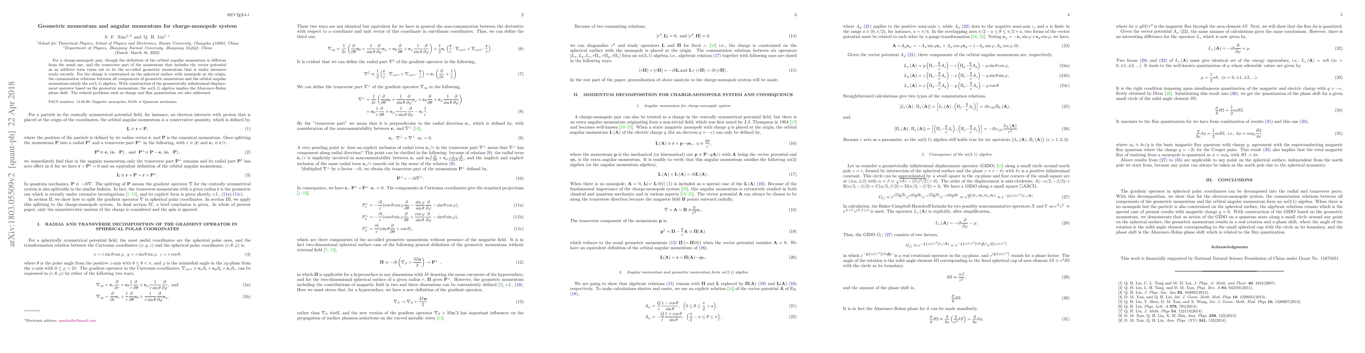 For a charge-monopole pair, though the definition of the orbital angular momentum is different from the usual one, and the transverse part of the momentum that includes the vector potential as an additive term turns out to be the so-called geometric momentum that is under intensive study recently. For the charge is constrained on the spherical surface with monopole at the origin, the commutation relations between all components of geometric momentum and the orbital angular momentum satisfy the $so(3,1)$ algebra. With construction of the geometrically infinitesimal displacement operator based on the geometric momentum, the $so(3,1)$ algebra implies the Aharonov-Bohm phase shift. The related problems such as charge and flux quantization are also addressed.