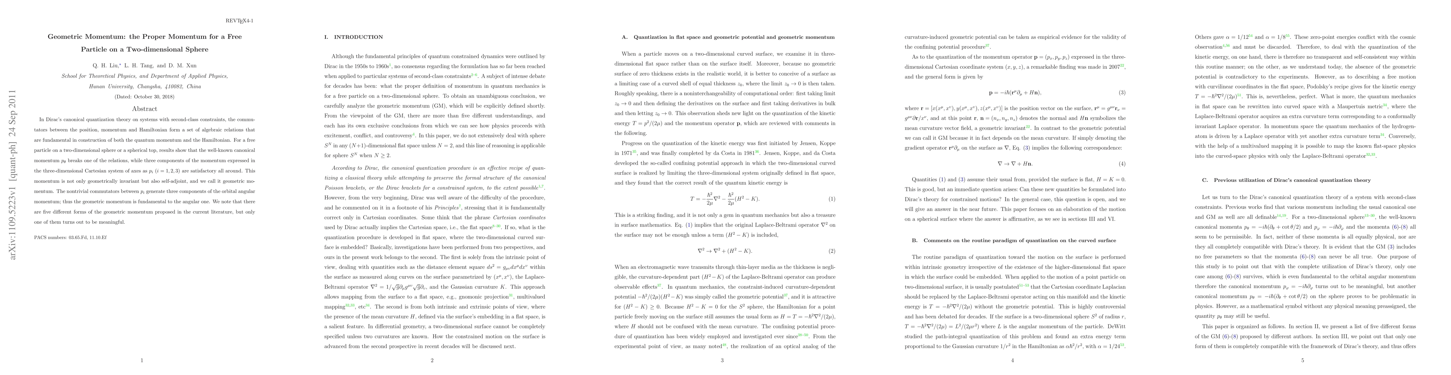 This paper proposes the geometric momentum as a proper momentum for a free particle on a two-dimensional sphere, which satisfies fundamental algebraic relations in Dirac's quantization theory. Unlike the canonical momentum, the geometric momentum is geometrically invariant, self-adjoint, and fundamental to the orbital angular momentum.