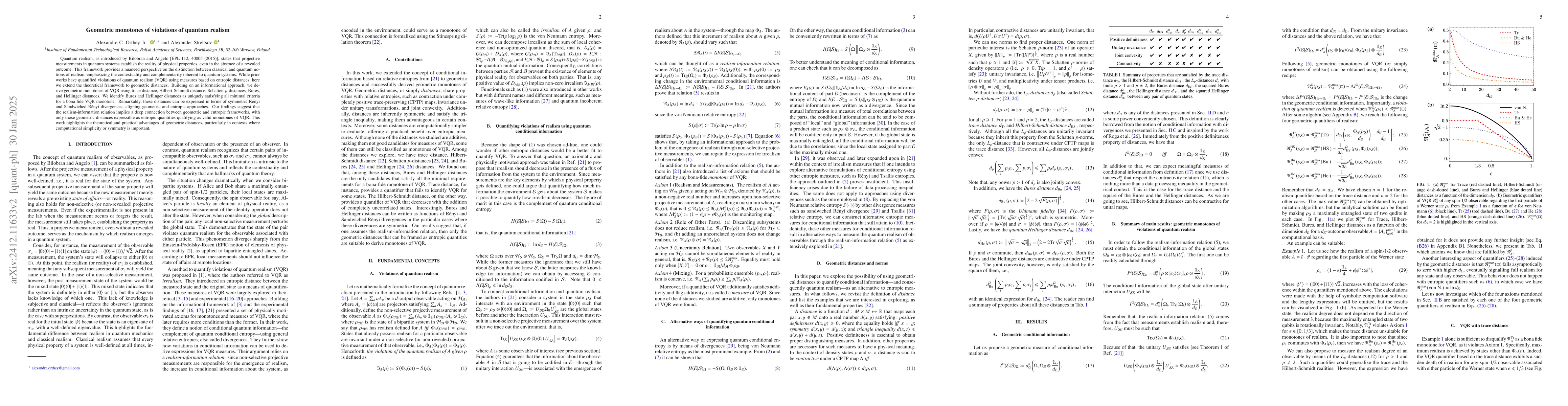 This paper extends the framework of quantum realism by introducing geometric distances to quantify violations of quantum realism, deriving geometric monotones using various distances, and identifying Bures and Hellinger distances as the only ones meeting all criteria for a valid monotone. It reveals a deep connection between geometric and entropic approaches, suggesting that only distances expressible as entropic quantities can serve as valid monotones.