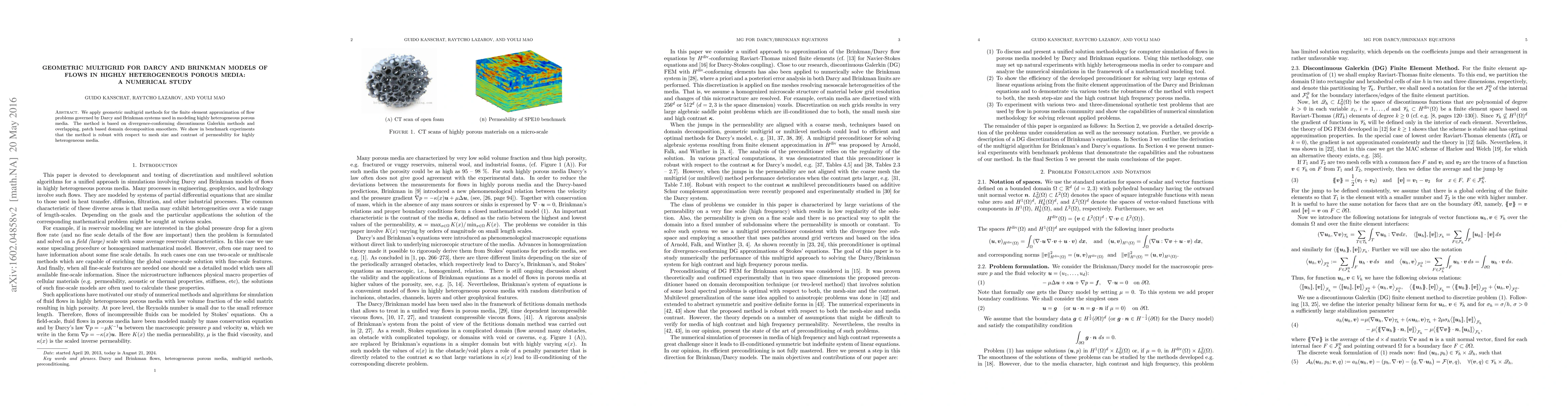 This paper investigates geometric multigrid methods for solving Darcy and Brinkman flow models in highly heterogeneous porous media using finite element approximation. The proposed method, based on divergence-conforming discontinuous Galerkin methods and overlapping smoothers, demonstrates robustness across varying mesh sizes and permeability contrasts.