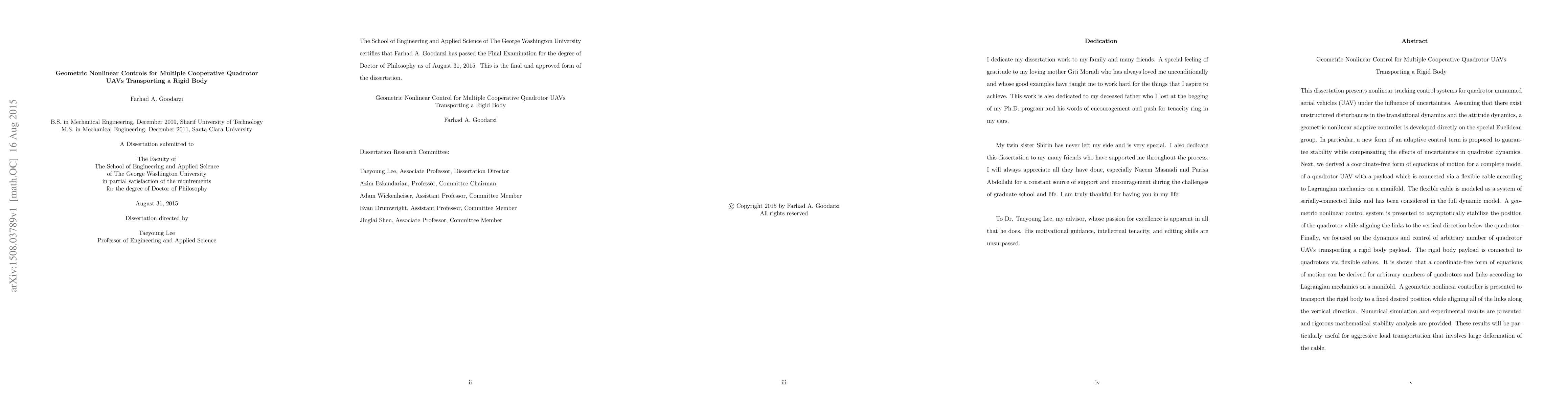 This dissertation presents nonlinear tracking control systems for quadrotor unmanned aerial vehicles (UAV) under the influence of uncertainties. Assuming that there exist unstructured disturbances in the translational dynamics and the attitude dynamics, a geometric nonlinear adaptive controller is developed directly on the special Euclidean group. In particular, a new form of an adaptive control term is proposed to guarantee stability while compensating the effects of uncertainties in quadrotor dynamics. Next, we derived a coordinate-free form of equations of motion for a complete model of a quadrotor UAV with a payload which is connected via a flexible cable according to Lagrangian mechanics on a manifold. The flexible cable is modeled as a system of serially-connected links and has been considered in the full dynamic model. A geometric nonlinear control system is presented to asymptotically stabilize the position of the quadrotor while aligning the links to the vertical direction below the quadrotor. Finally, we focused on the dynamics and control of arbitrary number of quadrotor UAVs transporting a rigid body payload. The rigid body payload is connected to quadrotors via flexible cables. It is shown that a coordinate-free form of equations of motion can be derived for arbitrary numbers of quadrotors and links according to Lagrangian mechanics on a manifold. A geometric nonlinear controller is presented to transport the rigid body to a fixed desired position while aligning all of the links along the vertical direction. Numerical simulation and experimental results are presented and rigorous mathematical stability analysis are provided. These results will be particularly useful for aggressive load transportation that involves large deformation of the cable.