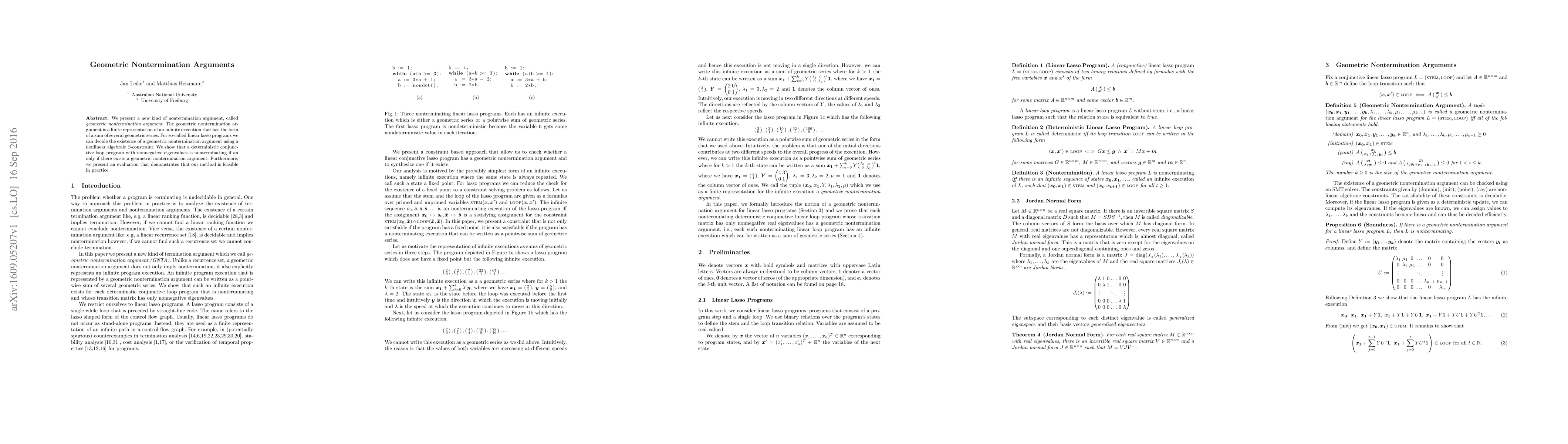 This paper introduces geometric nontermination arguments, a finite representation of infinite execution in linear lasso programs, and establishes a connection to nonlinear algebraic constraints. It proves that a deterministic conjunctive loop program with nonnegative eigenvalues is nonterminating if such arguments exist, and demonstrates the practical feasibility of the method.