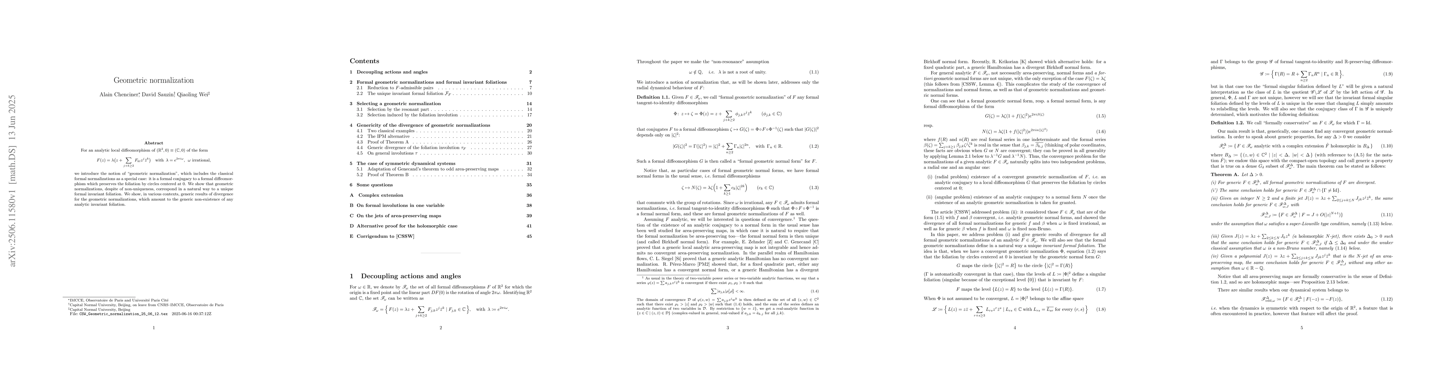 For a local analytic diffeomorphism of the plane with an irrational elliptic fixed point at 0, we introduce the notion of ``geometric normalization'', which includes the classical formal normalizations as a special case: it is a formal conjugacy to a formal diffeomorphism which preserves the foliation by circles centered at 0. We show that geometric normalizations, despite of non-uniqueness, correspond in a natural way to a unique formal invariant foliation. We show, in various contexts, generic results of divergence for the geometric normalizations, which amount to the generic non-existence of any analytic invariant foliation.