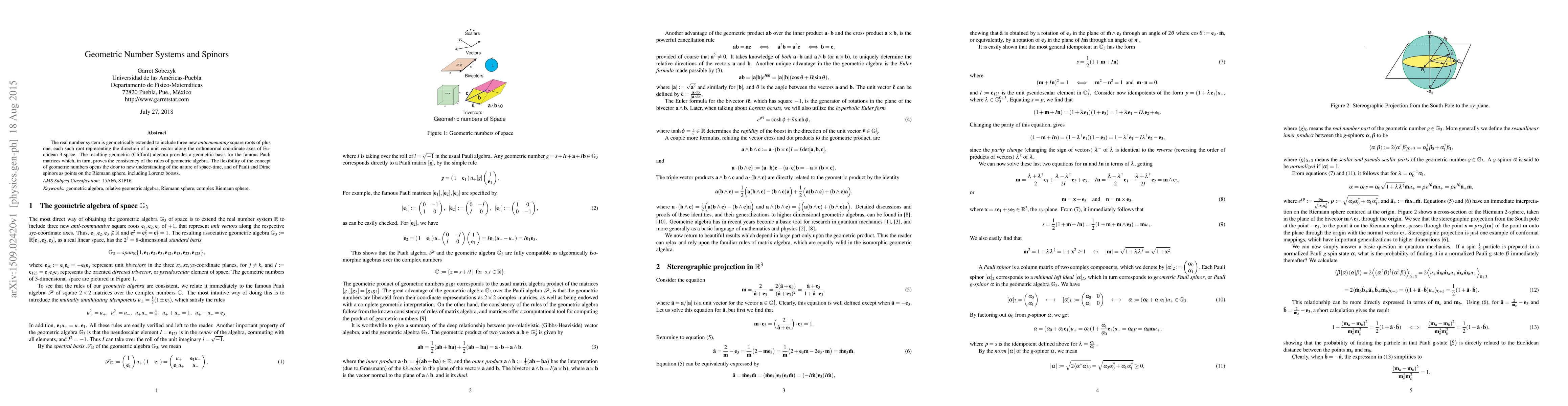 The real number system is geometrically extended to include three new anticommuting square roots of plus one, each such root representing the direction of a unit vector along the orthonormal coordinate axes of Euclidean 3-space. The resulting geometric (Clifford) algebra provides a geometric basis for the famous Pauli matrices which, in turn, proves the consistency of the rules of geometric algebra. The flexibility of the concept of geometric numbers opens the door to new understanding of the nature of space-time, and of Pauli and Dirac spinors as points on the Riemann sphere, including Lorentz boosts.