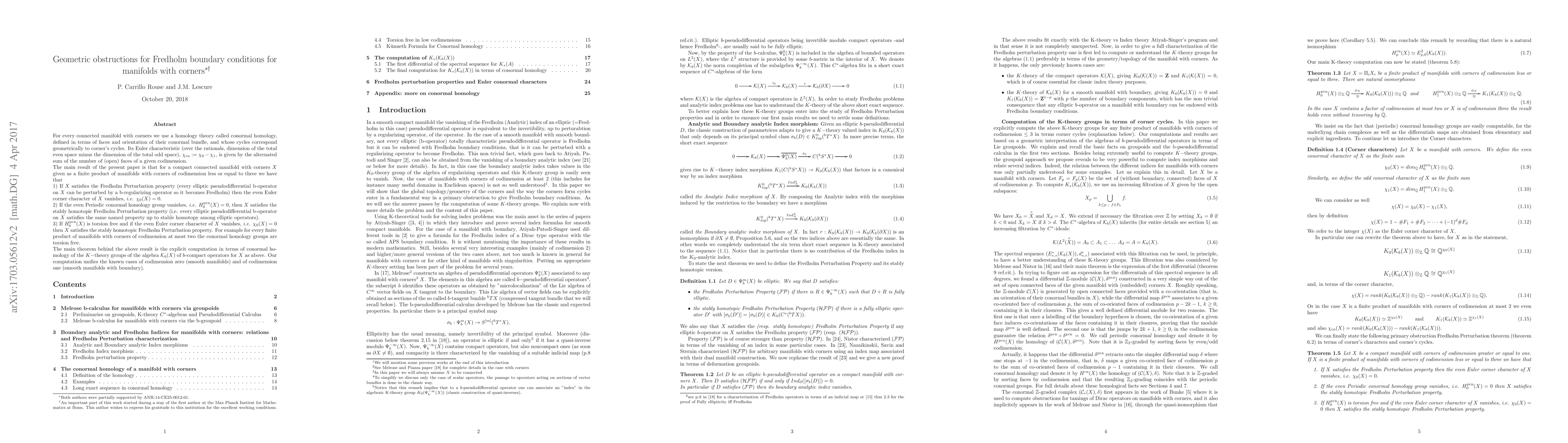 This paper explores the Fredholm boundary conditions for manifolds with corners, establishing geometric obstructions using conormal homology. The key findings include that the vanishing of the even Euler corner character and certain conormal homology groups indicates specific Fredholm Perturbation properties, and the explicit computation of $K$-theory groups unifies previous results for smooth and boundary manifolds.