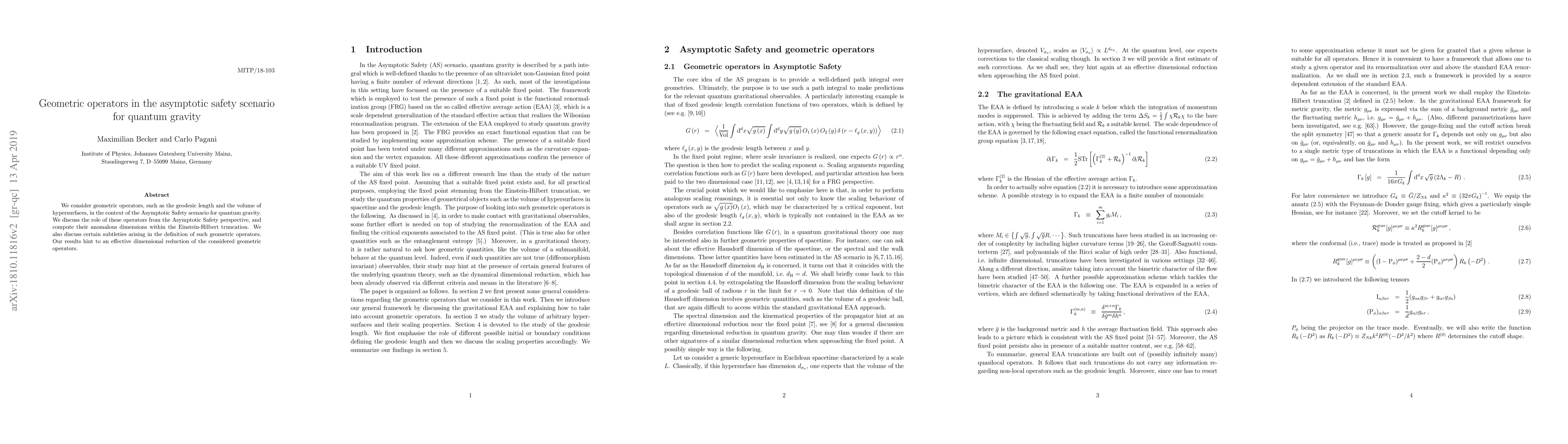 This paper examines geometric operators like geodesic length and hypersurface volume in the Asymptotic Safety framework for quantum gravity, computing their anomalous dimensions within the Einstein-Hilbert truncation and highlighting an effective dimensional reduction. Subtleties in defining these operators are also discussed.