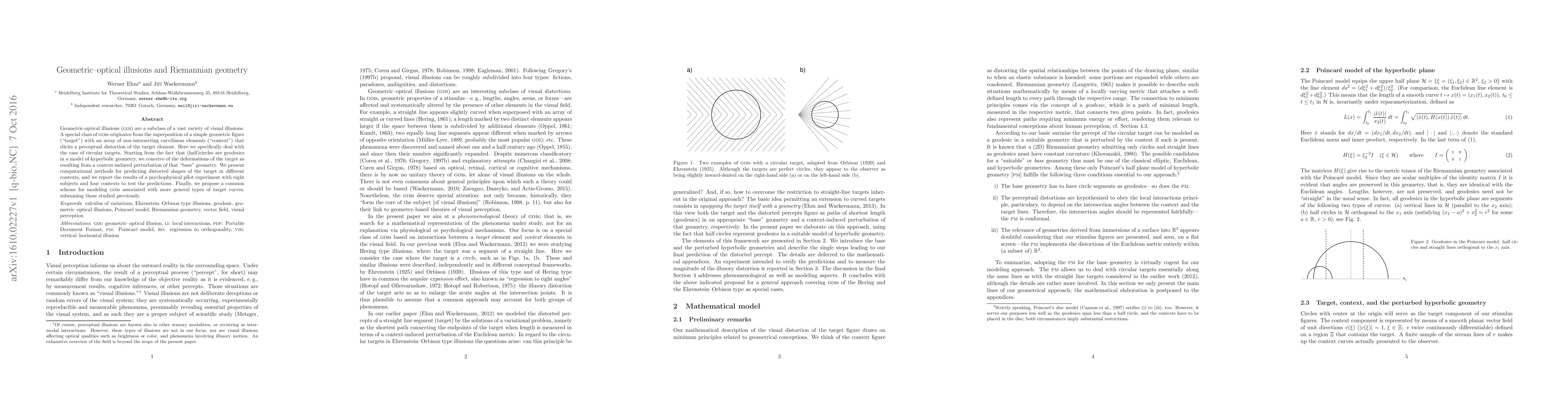Geometric-optical illusions (GOI) are a subclass of a vast variety of visual illusions. A special class of GOIs originates from the superposition of a simple geometric figure ("target") with an array of non-intersecting curvilinear elements ("context") that elicits a perceptual distortion of the target element. Here we specifically deal with the case of circular targets. Starting from the fact that (half)circles are geodesics in a model of hyperbolic geometry, we conceive of the deformations of the target as resulting from a context-induced perturbation of that "base" geometry. We present computational methods for predicting distorted shapes of the target in different contexts, and we report the results of a psychophysical pilot experiment with eight subjects and four contexts to test the predictions. Finally, we propose a common scheme for modeling GOIs associated with more general types of target curves, subsuming those studied previously.