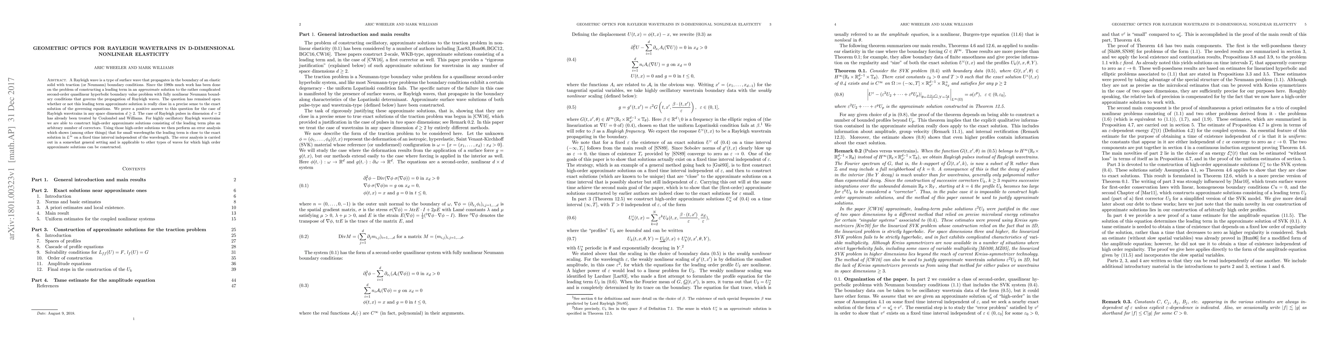 The research employs geometric optics for Rayleigh wavetrains in d-dimensional nonlinear elasticity, constructing high-order approximate solutions and performing an error analysis to show closeness to the exact solution for small wavelengths.