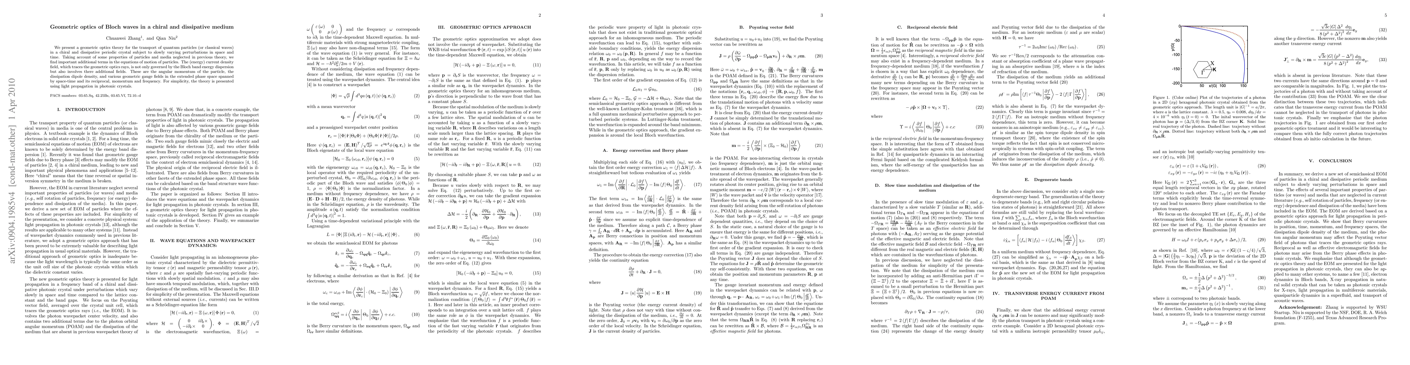 The paper develops a geometric optics theory for Bloch waves in chiral and dissipative periodic crystals, revealing new terms in particle motion equations influenced by angular momentum, dissipation, and geometric gauge fields. The study uses light propagation in photonic crystals to illustrate these effects.