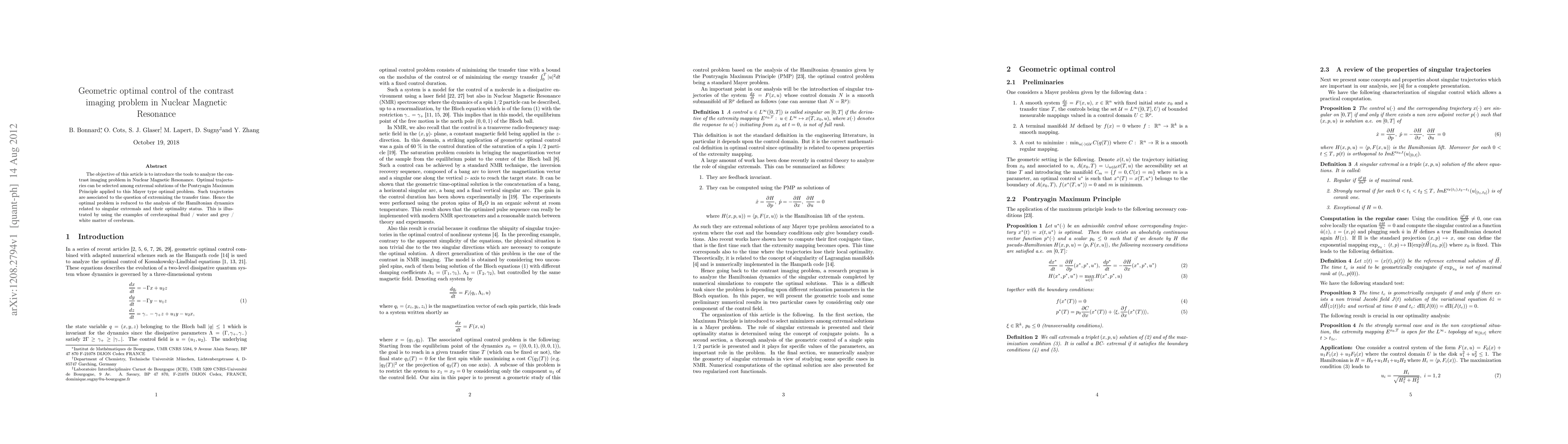 The objective of this article is to introduce the tools to analyze the contrast imaging problem in Nuclear Magnetic Resonance. Optimal trajectories can be selected among extremal solutions of the Pontryagin Maximum Principle applied to this Mayer type optimal problem. Such trajectories are associated to the question of extremizing the transfer time. Hence the optimal problem is reduced to the analysis of the Hamiltonian dynamics related to singular extremals and their optimality status. This is illustrated by using the examples of cerebrospinal fluid / water and grey / white matter of cerebrum.